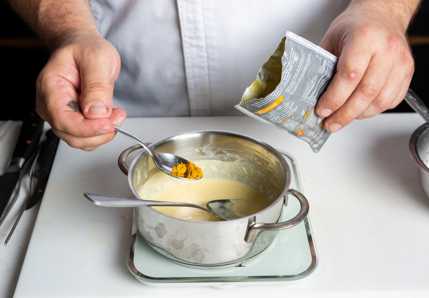 Всыпьте пармезан, приправьте солью и карри. Затем на медленном огне, непрерывно помешивая силиконовой лопаткой, доведите соус до однородной консистенции: пока сыр не растает, а текстура не станет гладкой и без комочков.