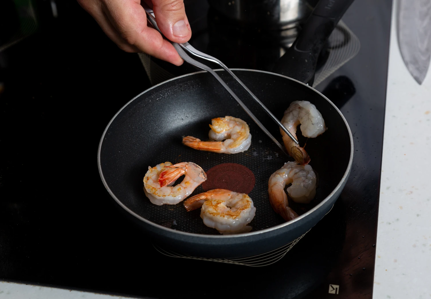 Разморозьте креветки заранее в холодильнике или за полчаса в ледяной воде прямо в упаковке.