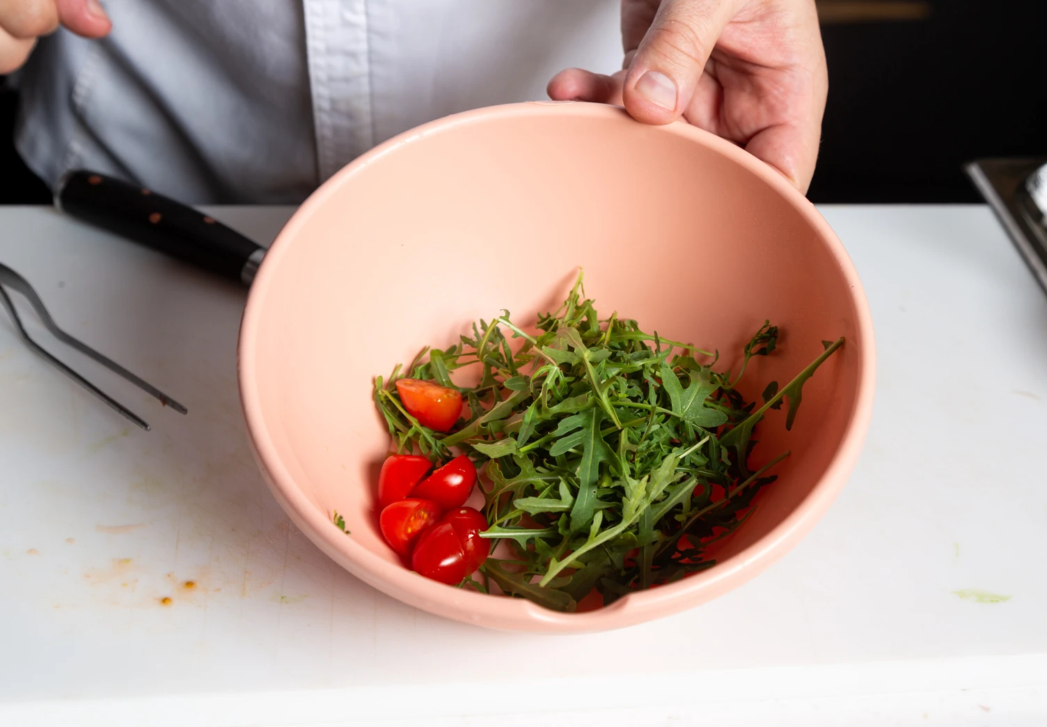 Смешайте черри с руколой, заправьте лимонным соусом и посыпьте тёртым пармезаном.