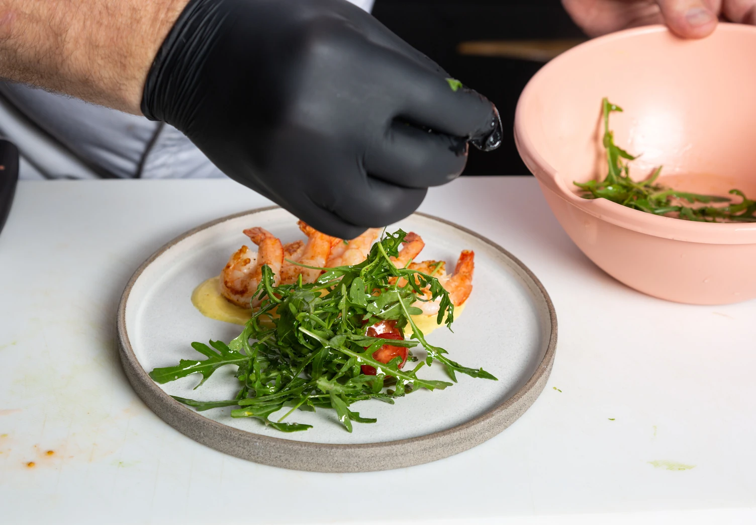 Подавайте креветки с тёплым манговым соусом и салатом.