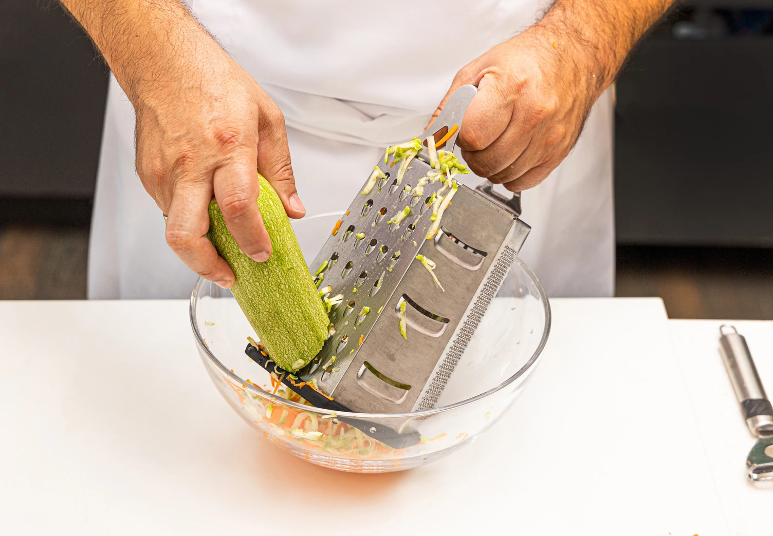 Натрите кабачок и морковь на крупной тёрке, отожмите их от лишнего сока.
