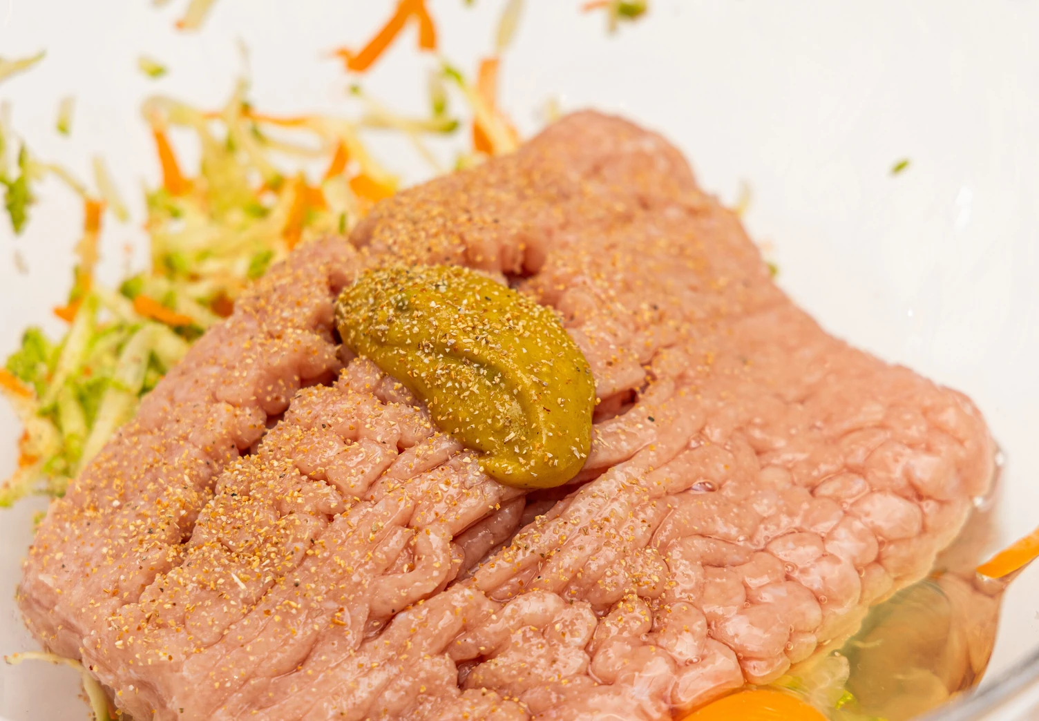 Соедините вместе фарш, овощи, яйца и специи, хорошо перемешайте.