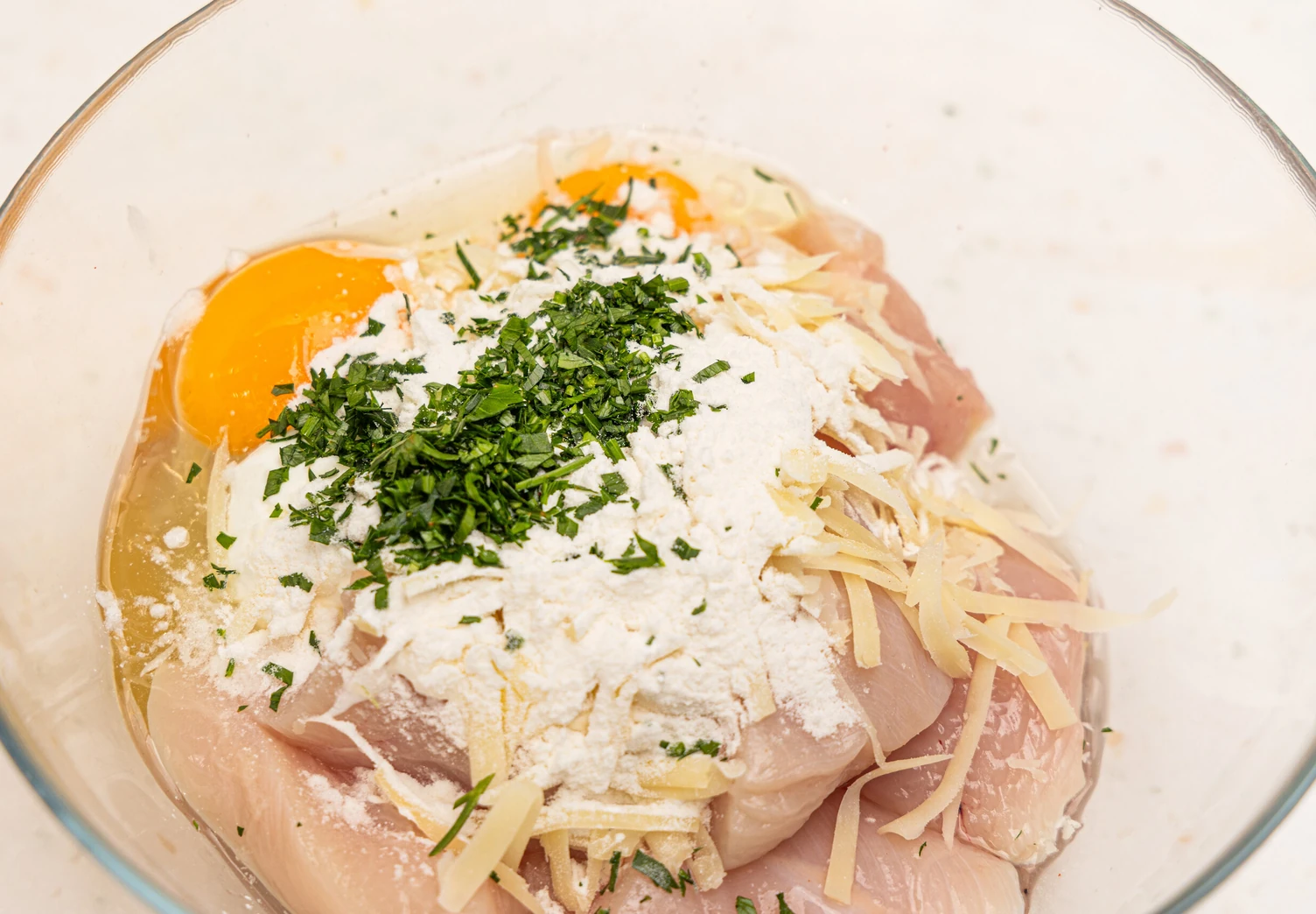 Переложите куриное филе в блендер. Добавьте зелень, тёртый сыр, сметану и яйца. Измельчите все ингредиенты до получения гладкой однородной массы.