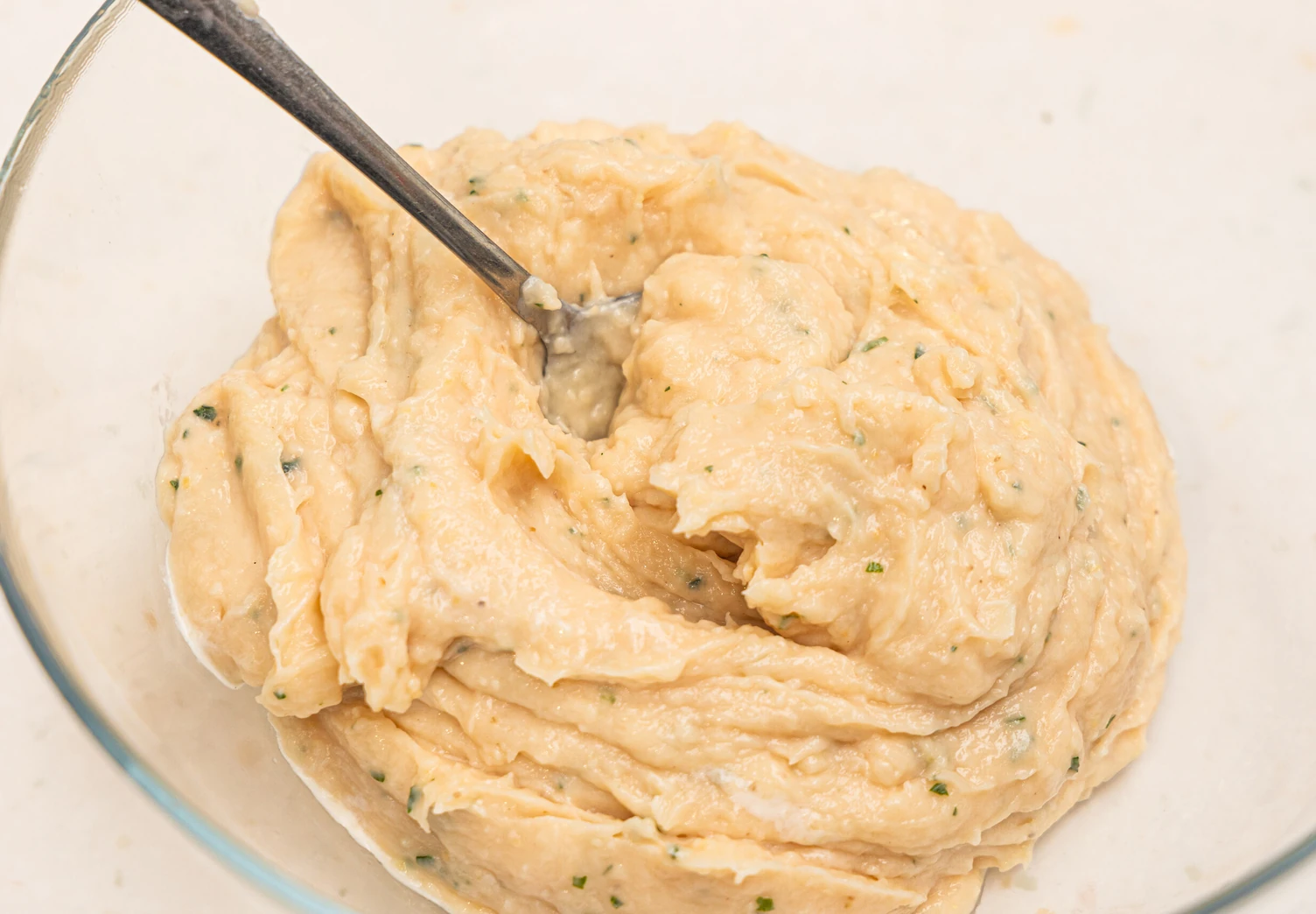 Добавьте соль, перец и сушёный чеснок. Затем всыпьте муку и ещё раз всё перемешайте. Тесто должно получиться достаточно густым.