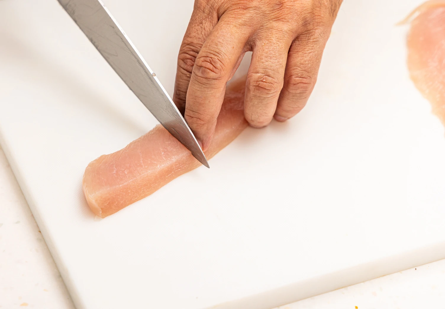 Нарежьте филе небольшими кусочками. Приправьте солью и перцем по вкусу.