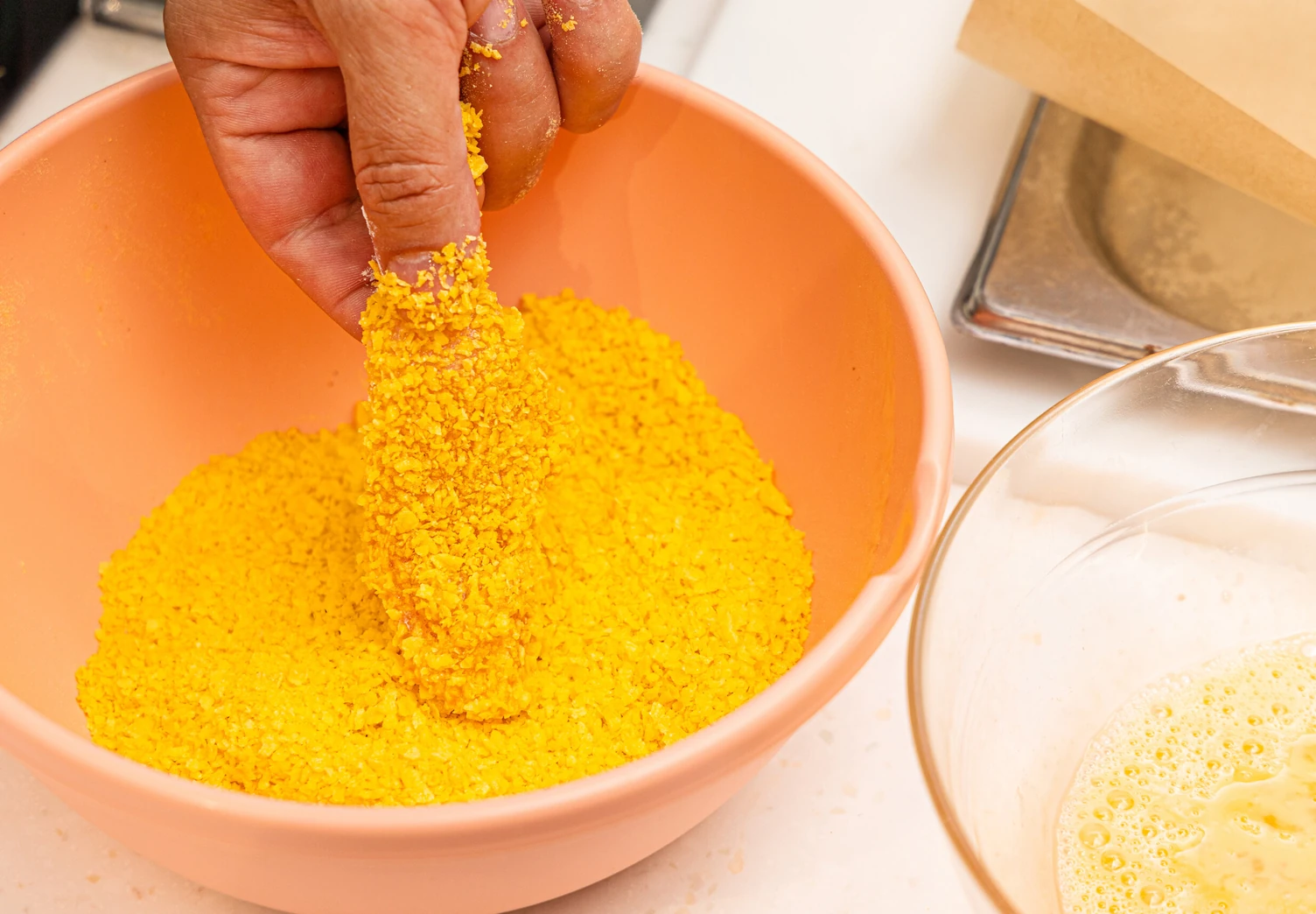 Обваляйте кусочки курицы в муке, затем окуните в яйцо и обсыпьте кукурузными хлопьями.