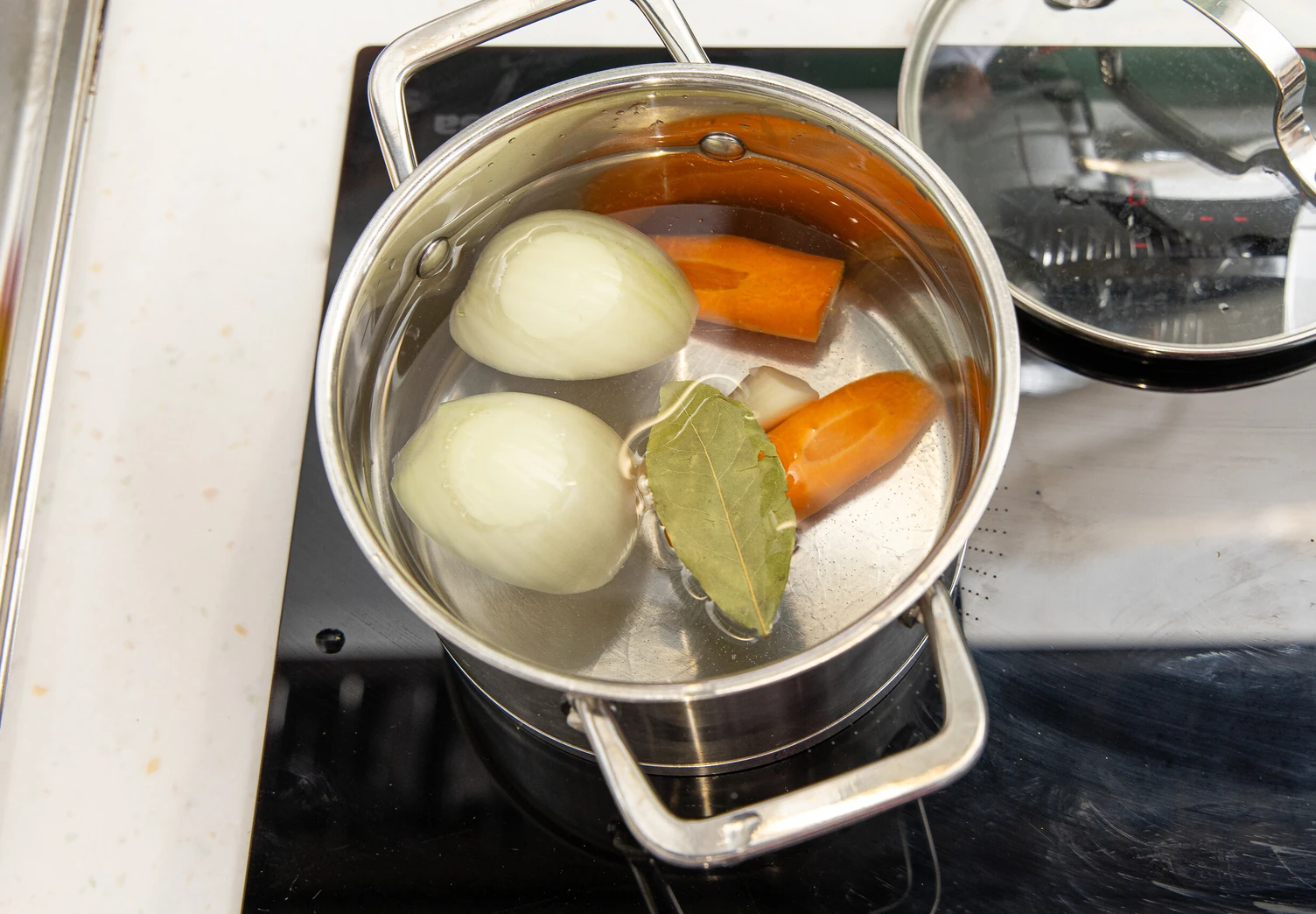 Для бульона лук и морковь произвольно нарежьте крупными кусками, положите вместе с остальными ингредиентами в кастрюлю и залейте 700 мл воды. Доведите до кипения, затем варите ещё 40 минут. Готовый бульон процедите.