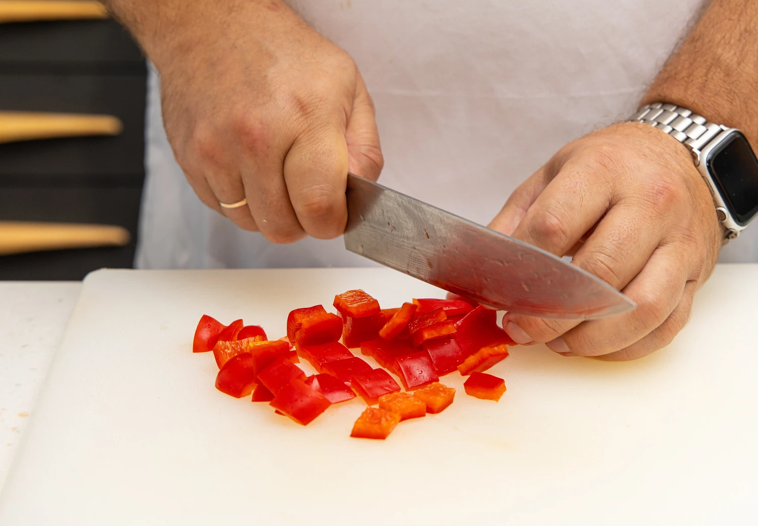 Разрежьте сладкий перец и перец чили, освободите их от семян и перегородок, нарежьте маленькими кубиками.