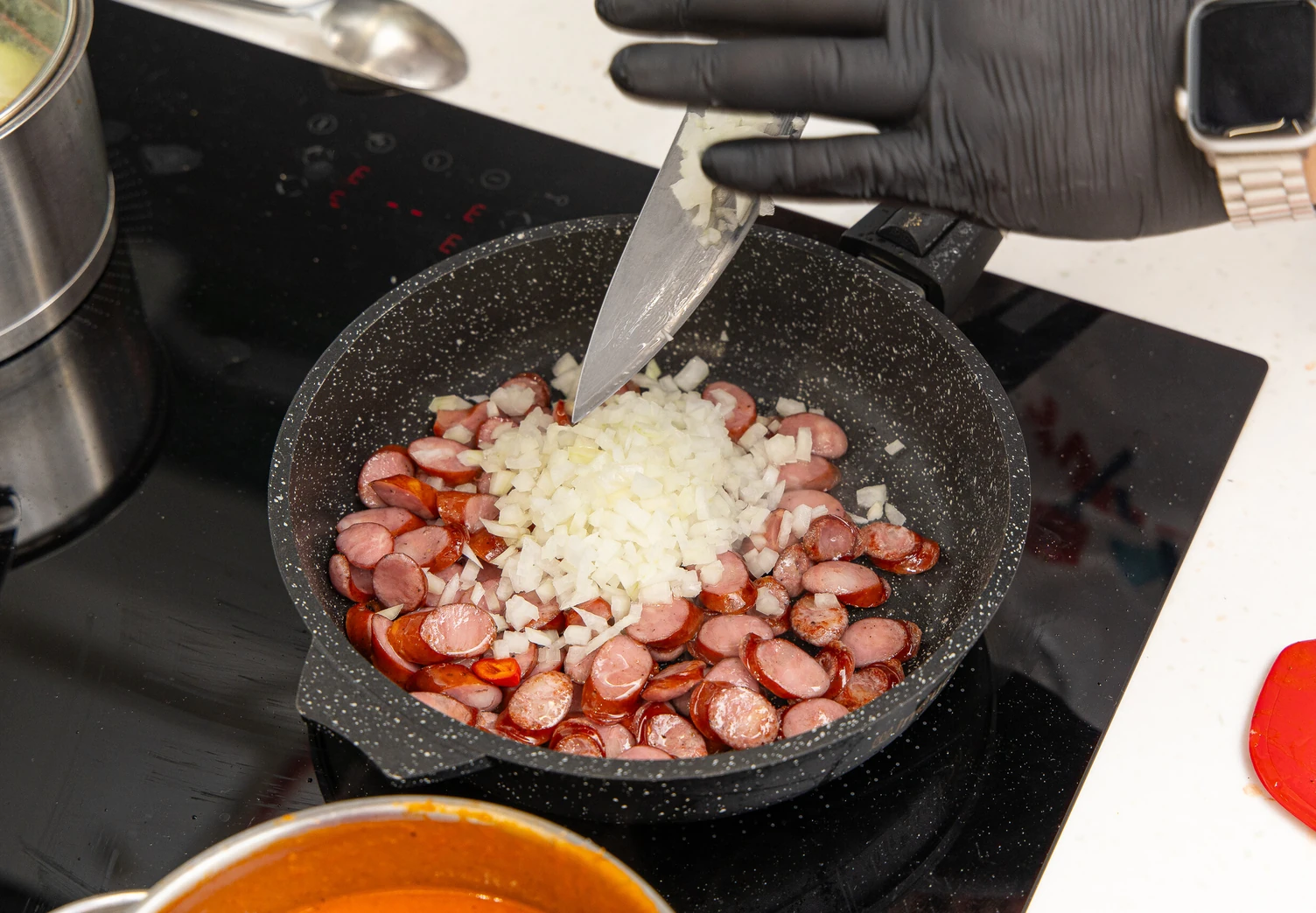 Нагрейте масло в кастрюле и обжаривайте на среднем огне колбаски, перец чили, лук и чеснок в течение 5–7 минут.