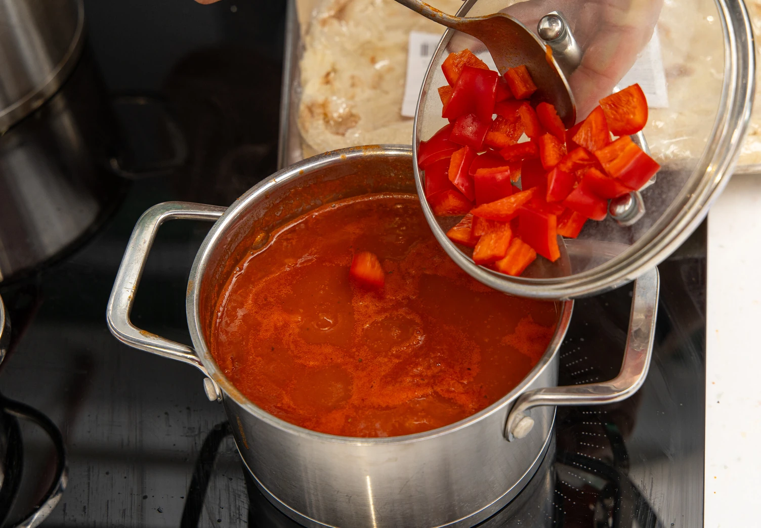 Соедините суп с оставшимся бульоном. Добавьте сладкий перец и готовьте ещё 5 минут.