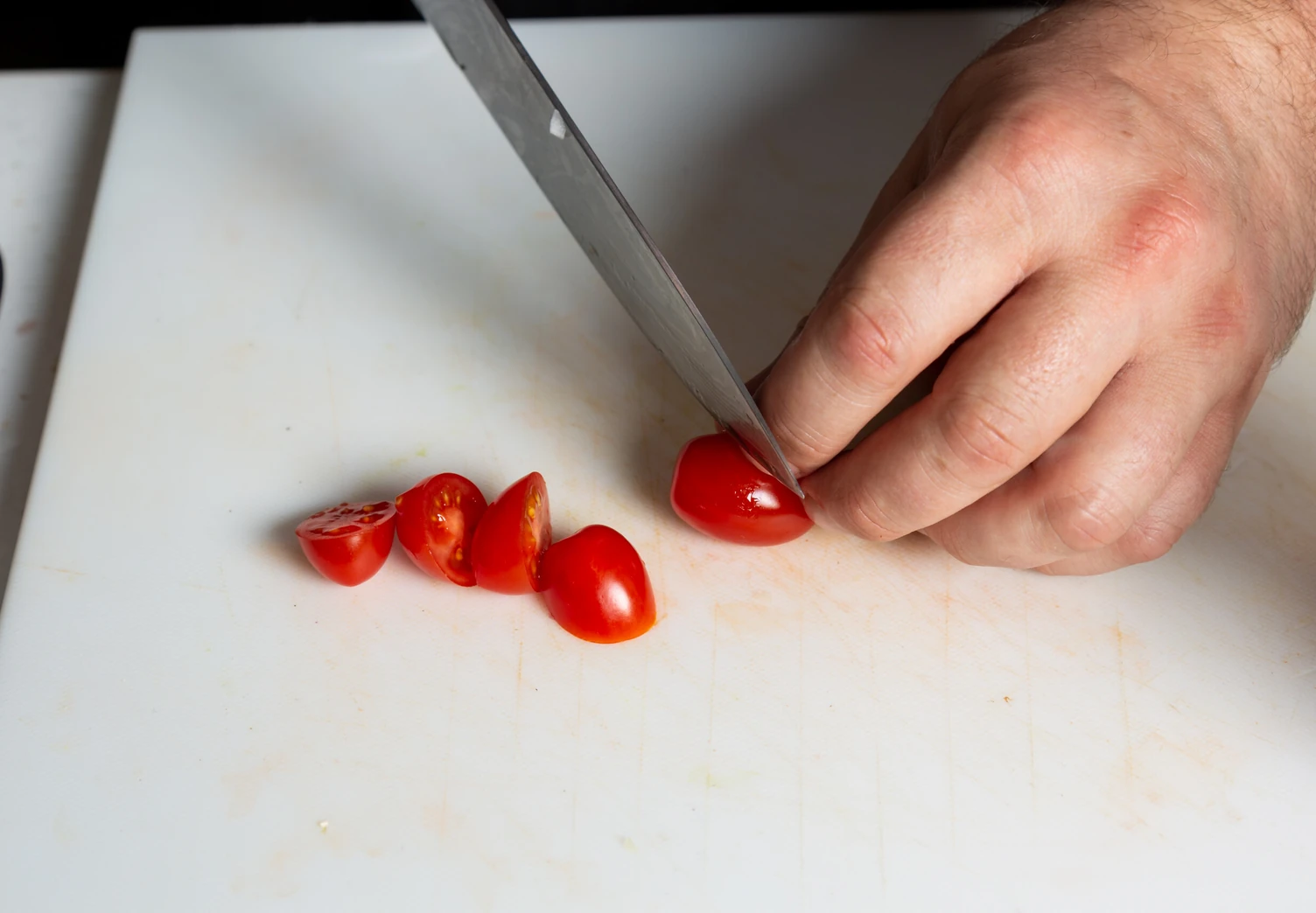 Смешайте пасту с соусом, добавьте черри и креветки и немедленно подавайте.