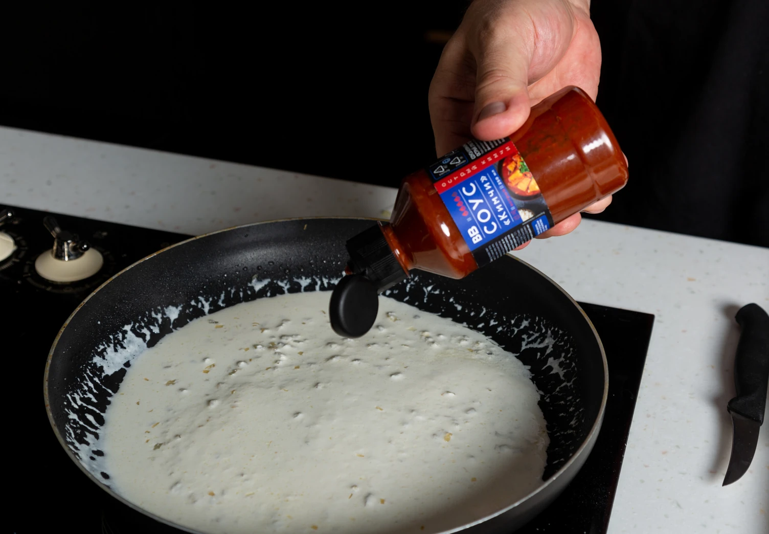 Влейте к луку сливки и кимчи, доведите до лёгкого кипения. Добавьте пармезан и перемешайте лопаткой до гладкого, однородного соуса.