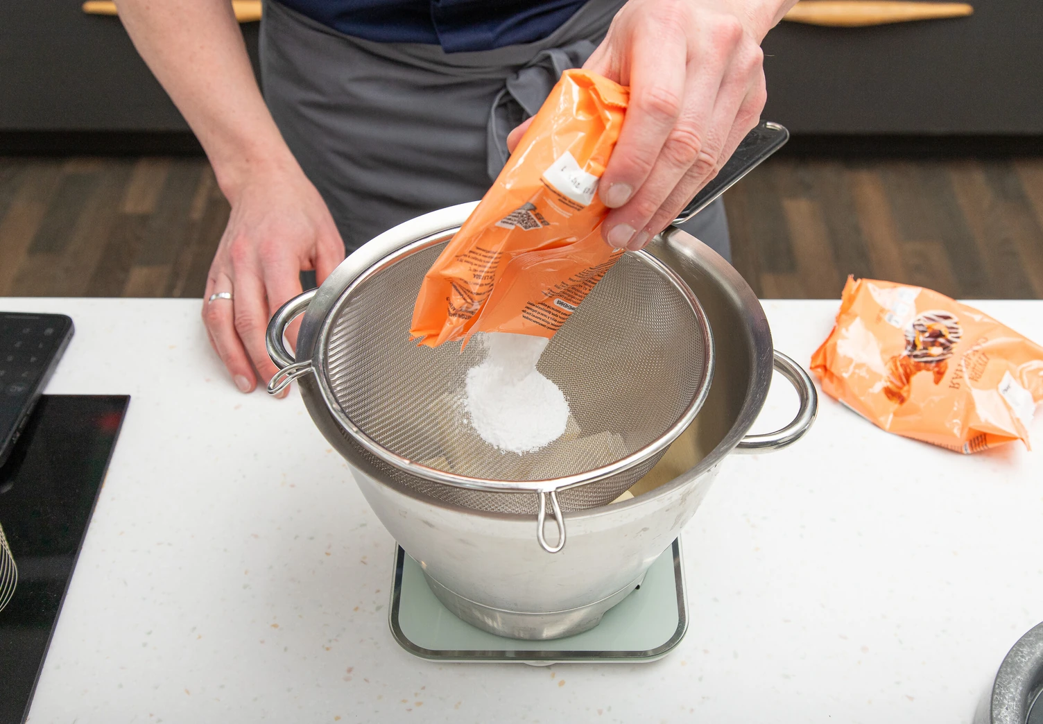 Смешайте муку, разрыхлитель, миндальную и сахарную пудру в глубокой миске.