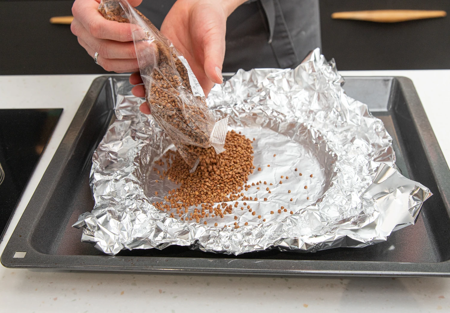 Выложите корж в форму для тарта, застелите пергаментом или фольгой и насыпьте какой-то груз: фасоль, бобы, гречку или пекарские камни. Выпекайте в духовке, разогретой до 200 градусов, 18 минут под грузом и ещё 3 минуты без него.