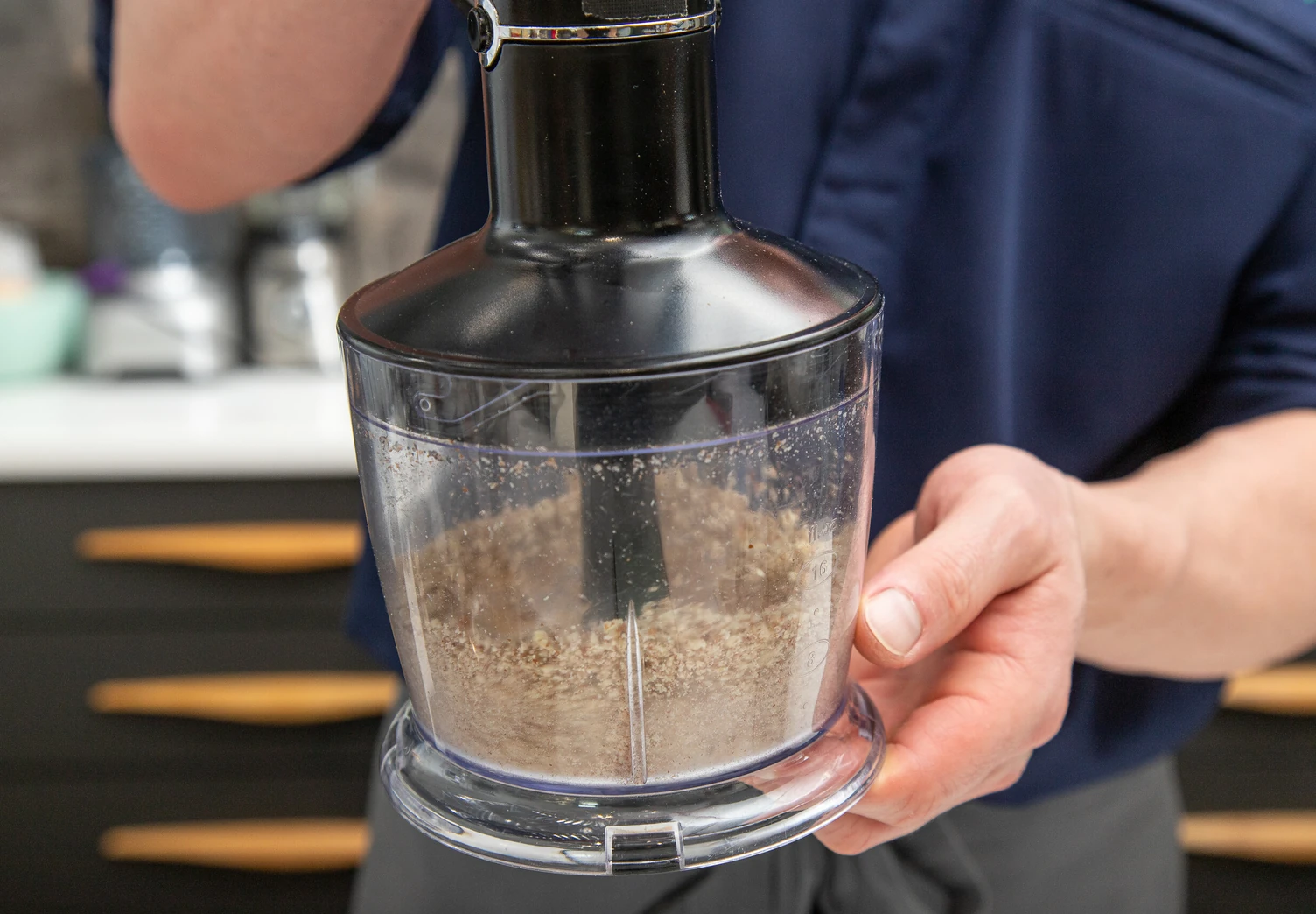 Пока печётся основа, приготовьте начинку. Для этого 30 г пекана измельчите с помощью блендера в пудру.