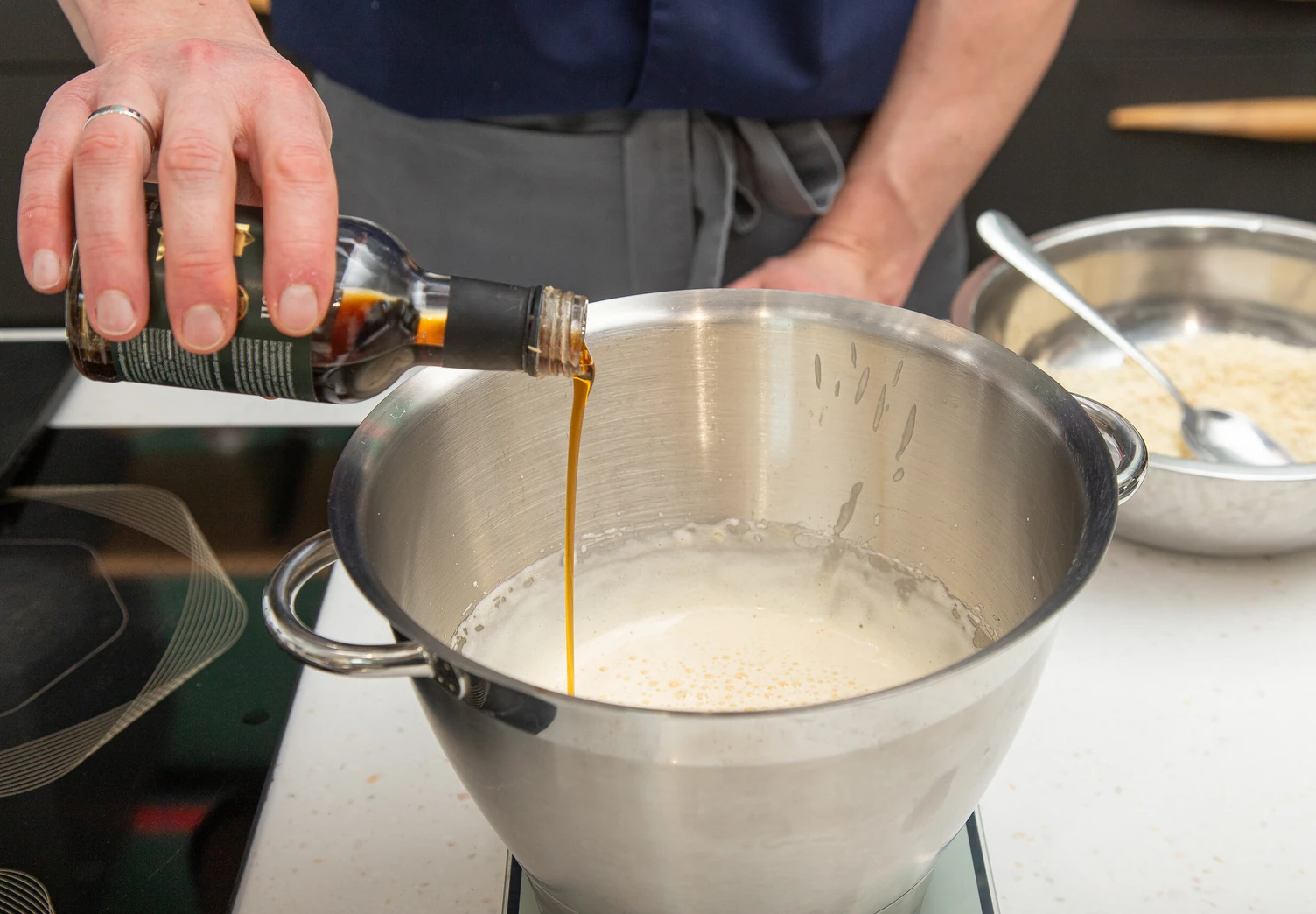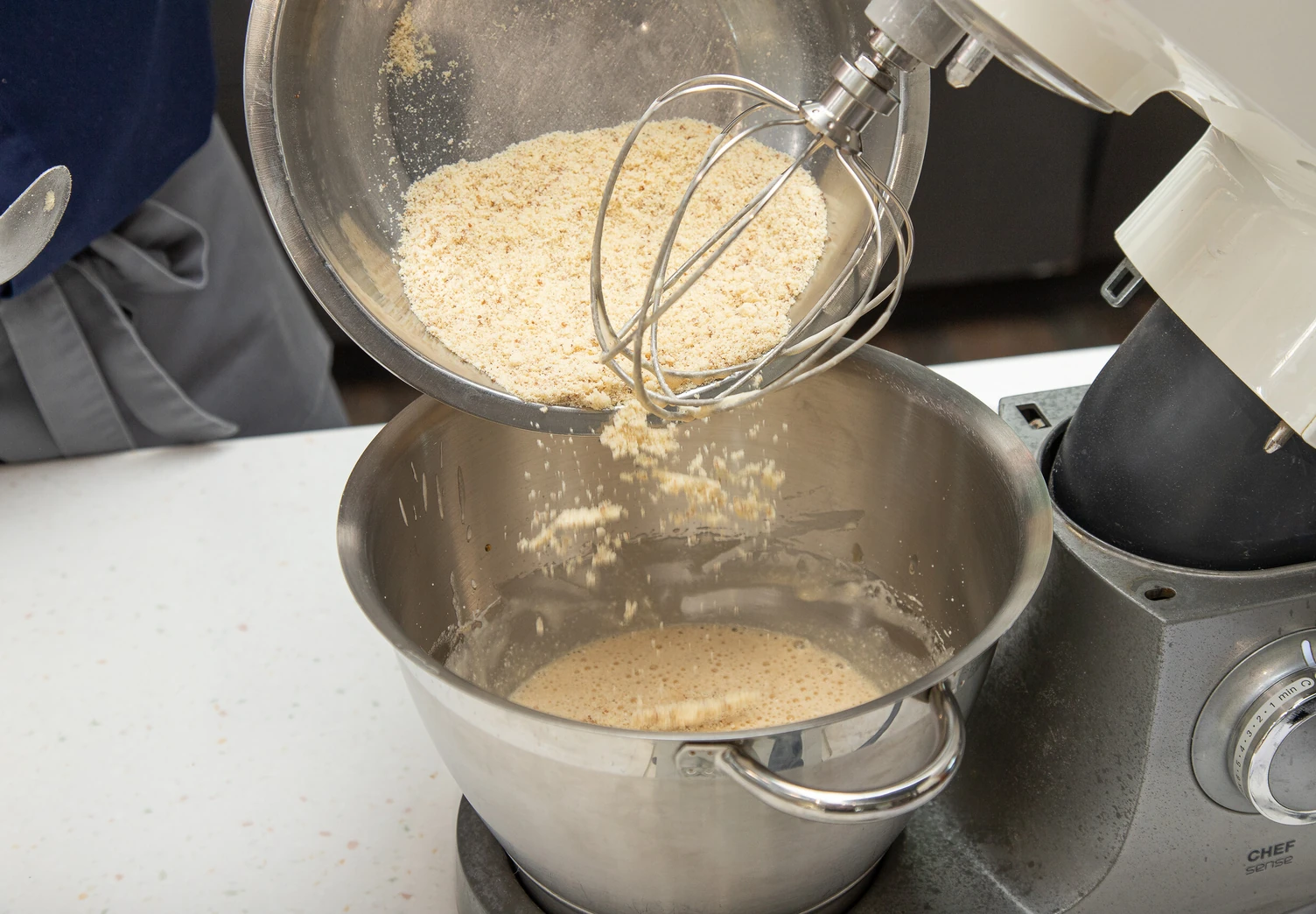 Затем всыпьте миндальную пудру, измельчённый пекан, муку и снова перемешайте.