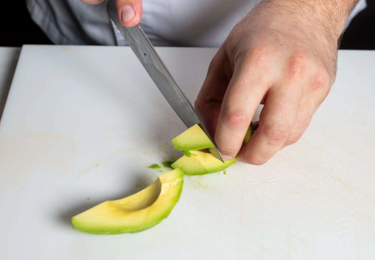 Огурцы, помидоры и авокадо нарежьте примерно одинаковыми по размеру средними ломтиками.