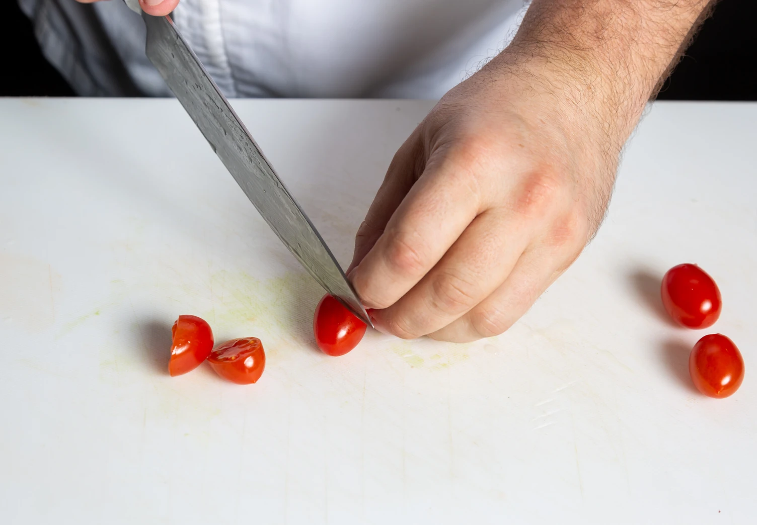Черри нарежьте на половинки, пармезан — на небольшие слайсы с помощью специальной тёрки или ножа-экономки.