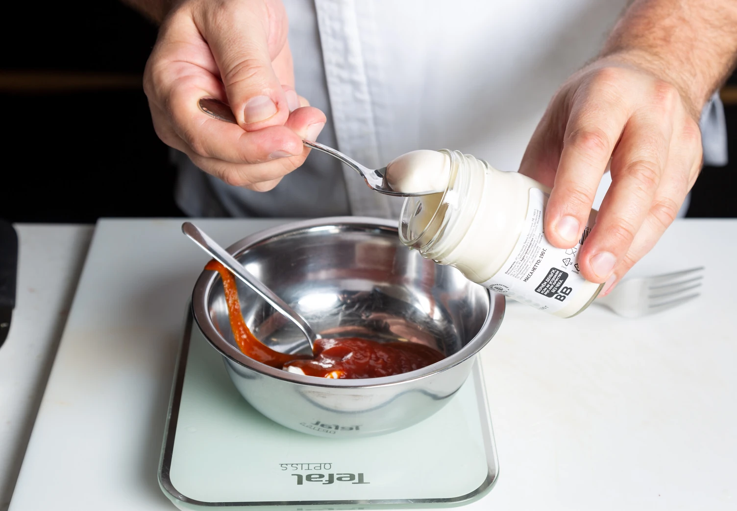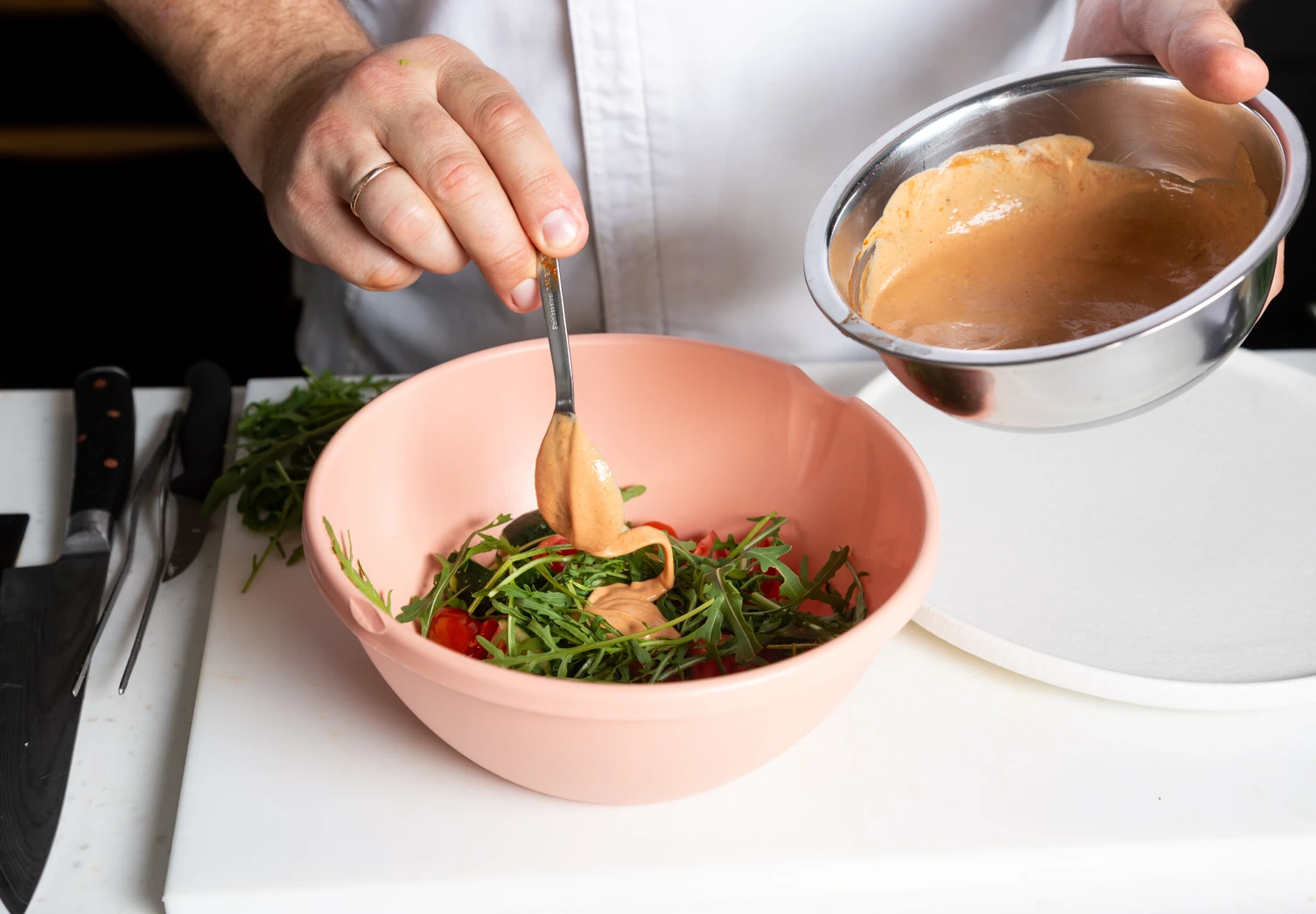 Для заправки смешайте сметану, соус кимчи, майонез и кетчуп до однородной массы.