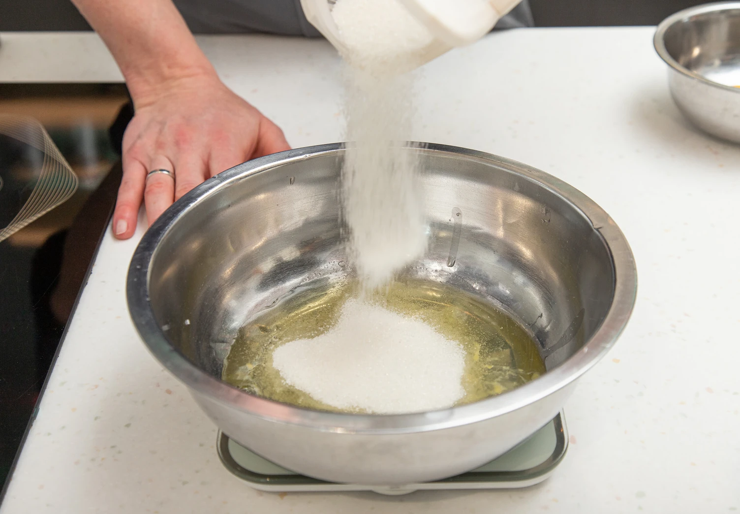 Пока печётся основа, приготовьте начинку. Для этого смешайте (но не взбивайте) белки с сахаром и солью, добавьте сыпучие ингредиенты и молоко. Перемешайте до однородности.