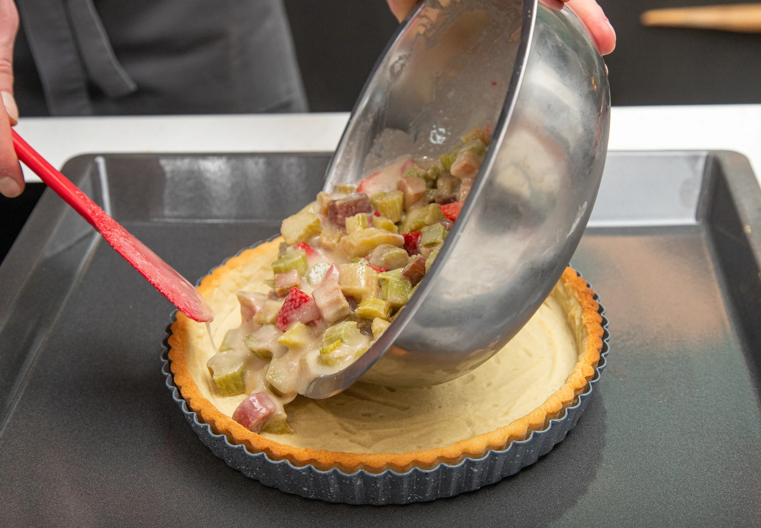 Смешайте клубнику и ревень с начинкой и распределите полученную массу равномерно по коржу. Выпекайте пирог в духовке, разогретой до 160 градусов, около часа.