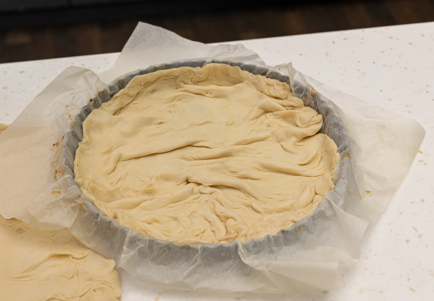 Один раскатанный корж выложите в форму для выпечки или на противень, застеленный пергаментом, формируя невысокий бортик.