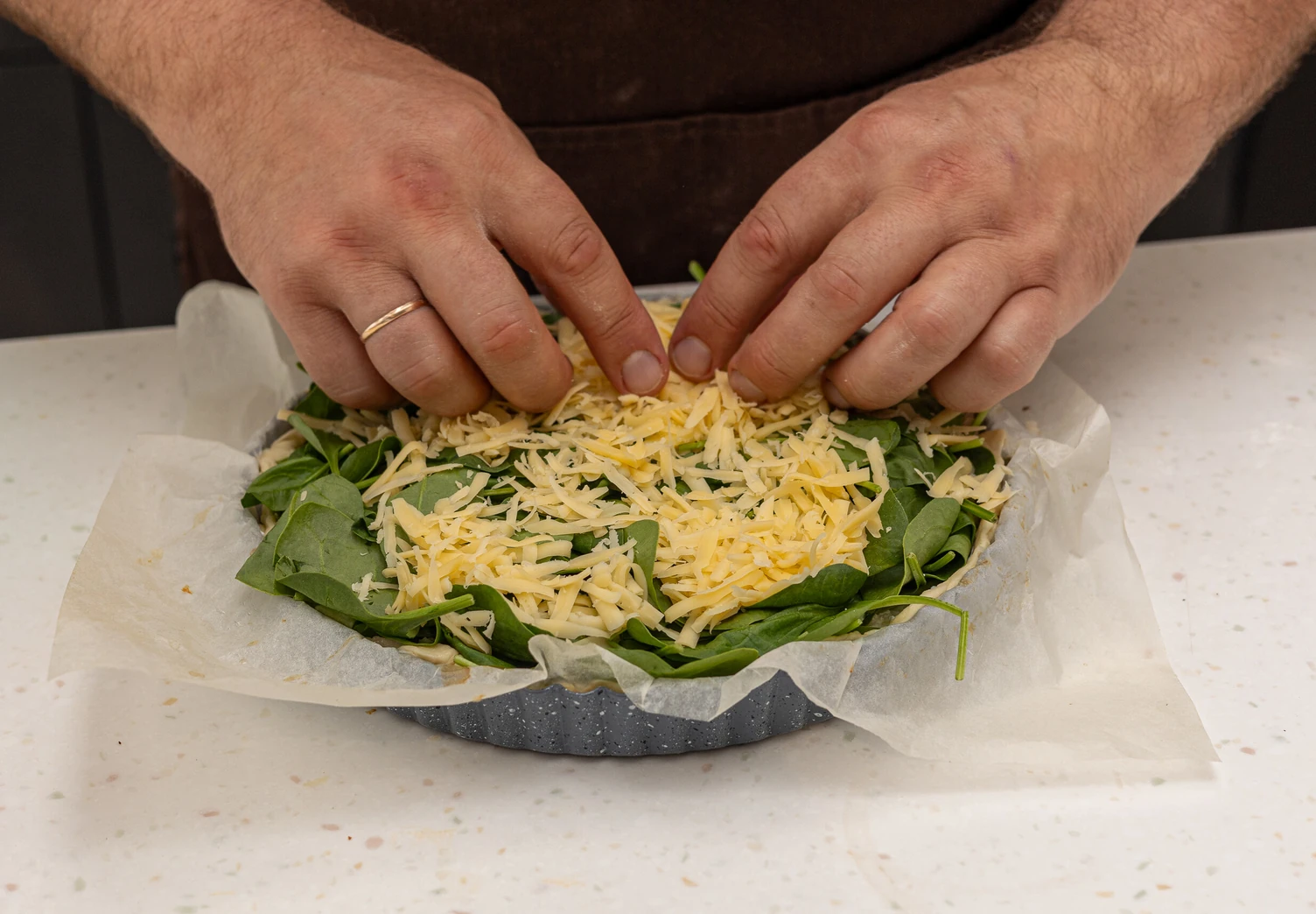 На тесто выложите творог, посолите по вкусу, дальше — шпинат и сыр, натёртый на крупной тёрке.