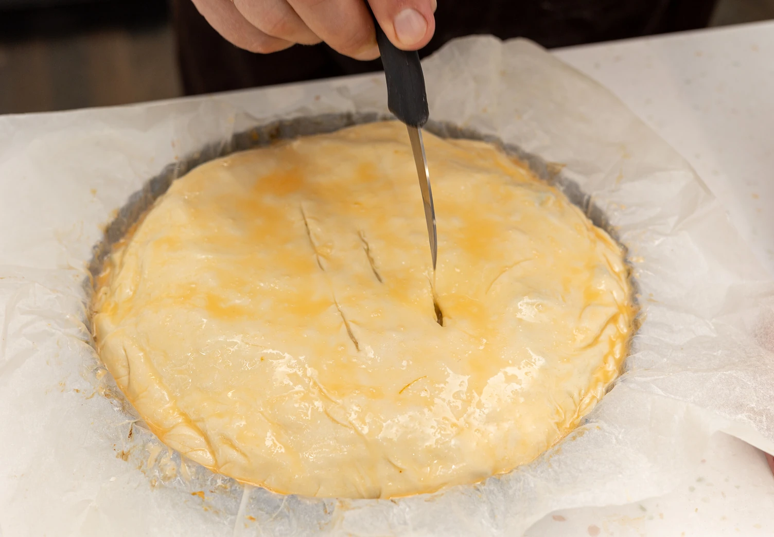 Накройте пирог половиной теста с разрезами и хорошо скрепите края.