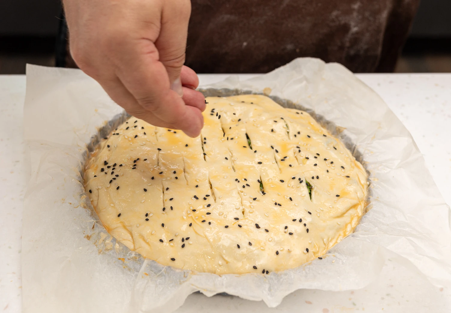 Взбейте вилкой оставшееся яйцо, смажьте им верх пирога и посыпьте кунжутом.