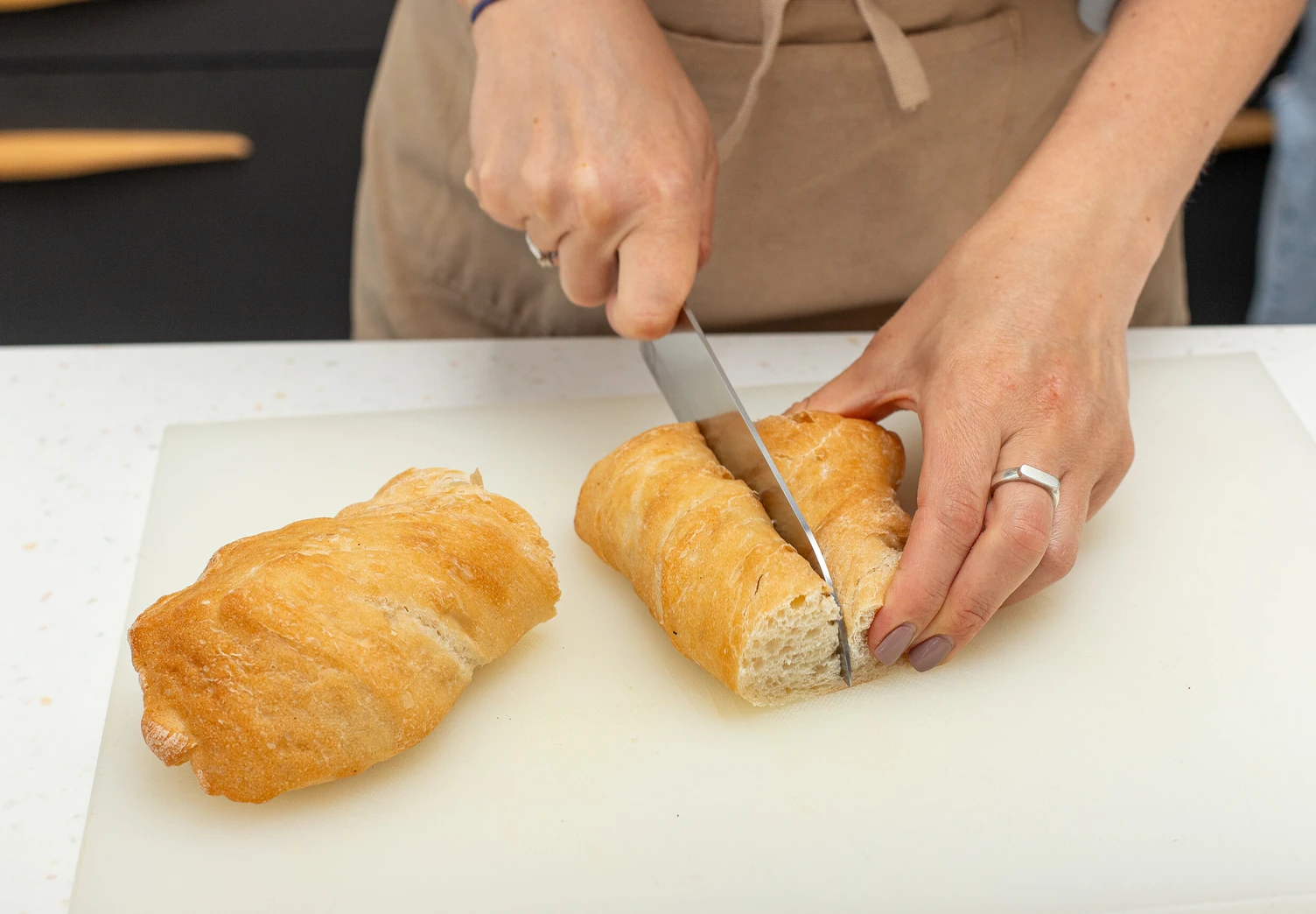 Хлеб нарежьте на куски шириной примерно 5 см. Для панцанеллы идеально подойдёт чиабатта или любой другой хлеб с относительно прочным мякишем.
