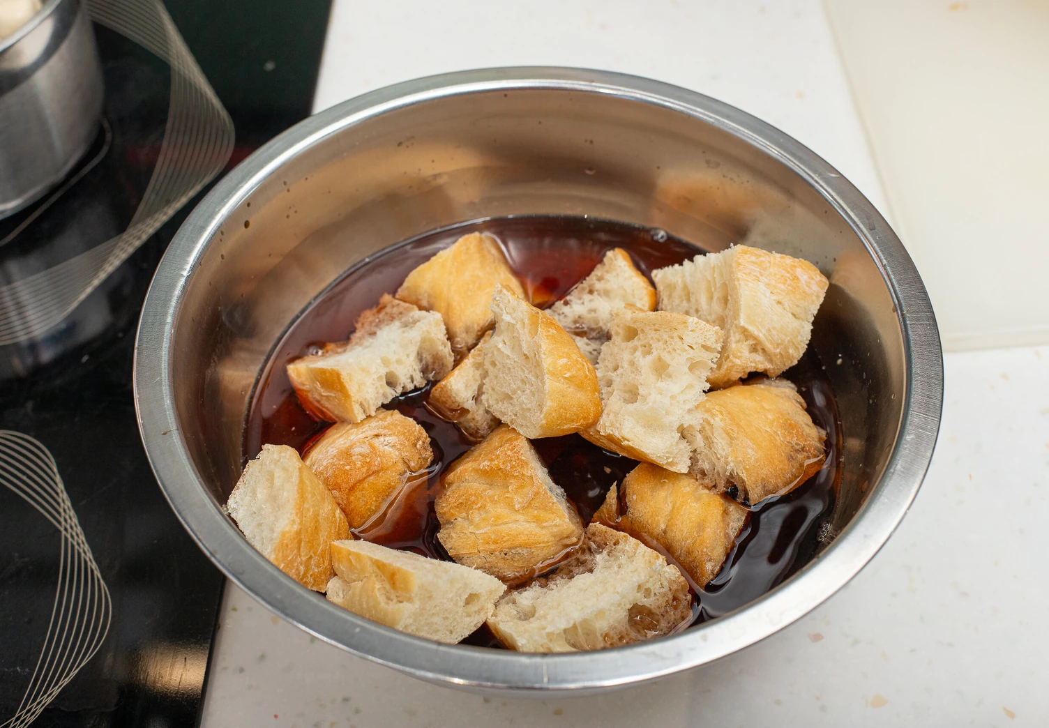 Налейте в глубокое блюдо холодную воду, смешанную с уксусом, и поместите туда куски хлеба. Оставьте на 20–30 минут.