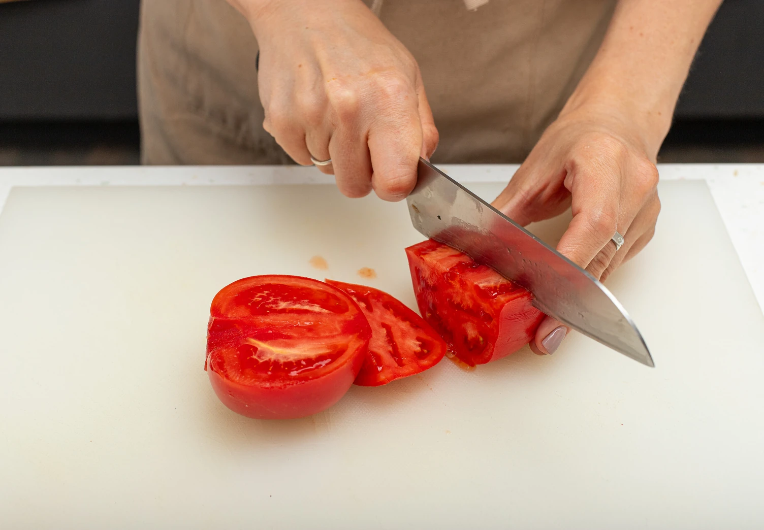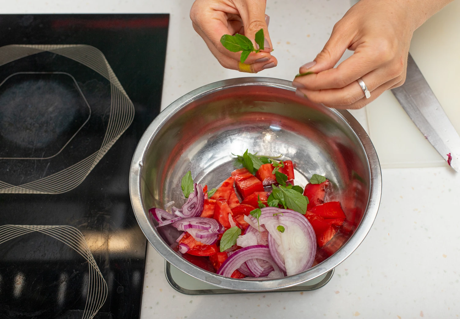 Нарежьте помидоры крупными дольками, лук — тонкими полукольцами, листья базилика порвите руками.