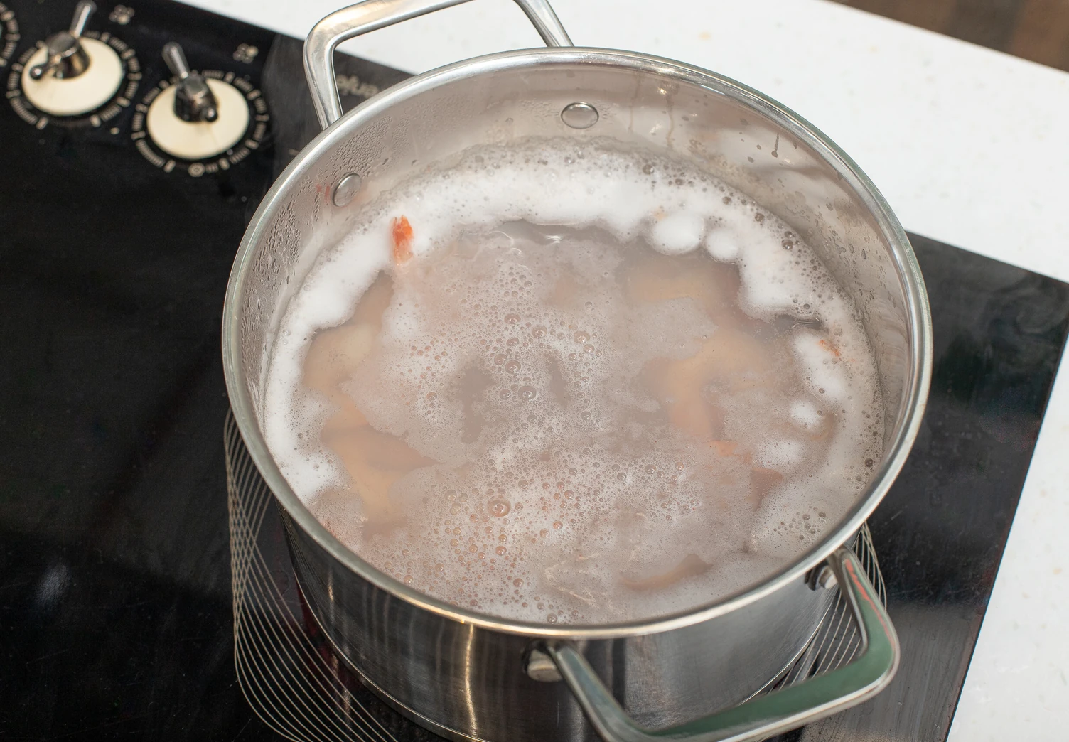 Креветки предварительно разморозьте и отварите в кипящей воде в течение 2 минут.