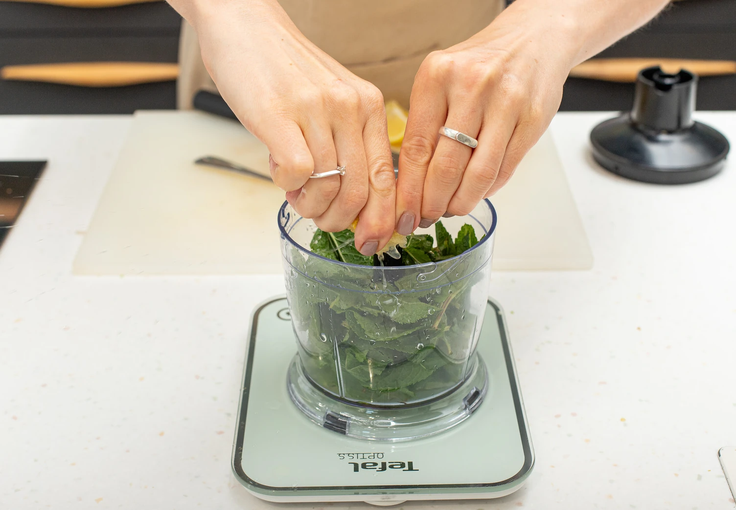 Для заправки взбейте в блендере листья мяты, 2 столовых ложки оливкового масла, лимонный и апельсиновый сок и соль. Должна получиться однородная кашица.