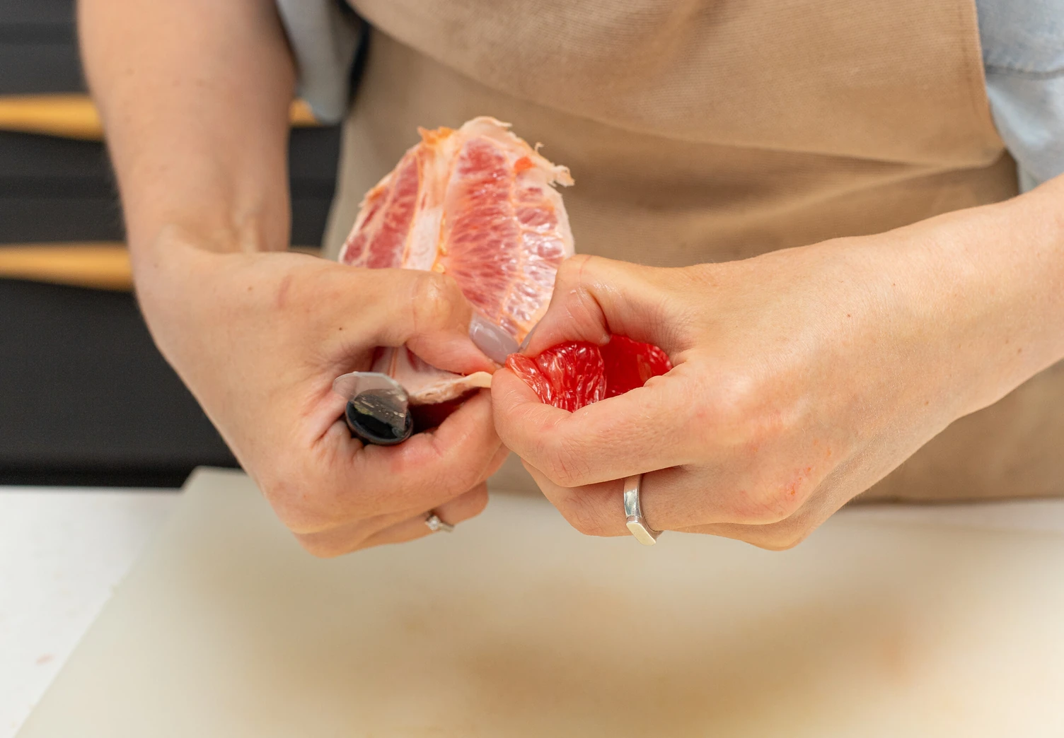 Грейпфрут очистите от плёнок и разберите на некрупные сегменты.