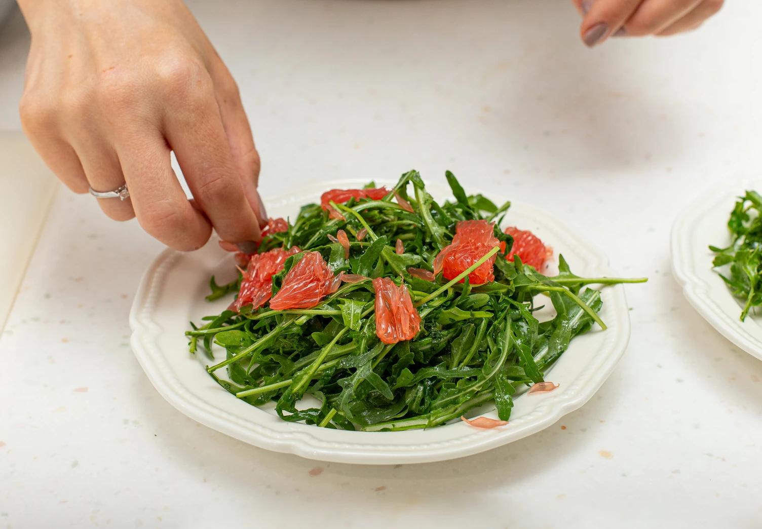 Вымытый и высушенный салат смешайте с ⅔ заправки и выложите на тарелку. Украсьте сверху ломтиками грейпфрута.