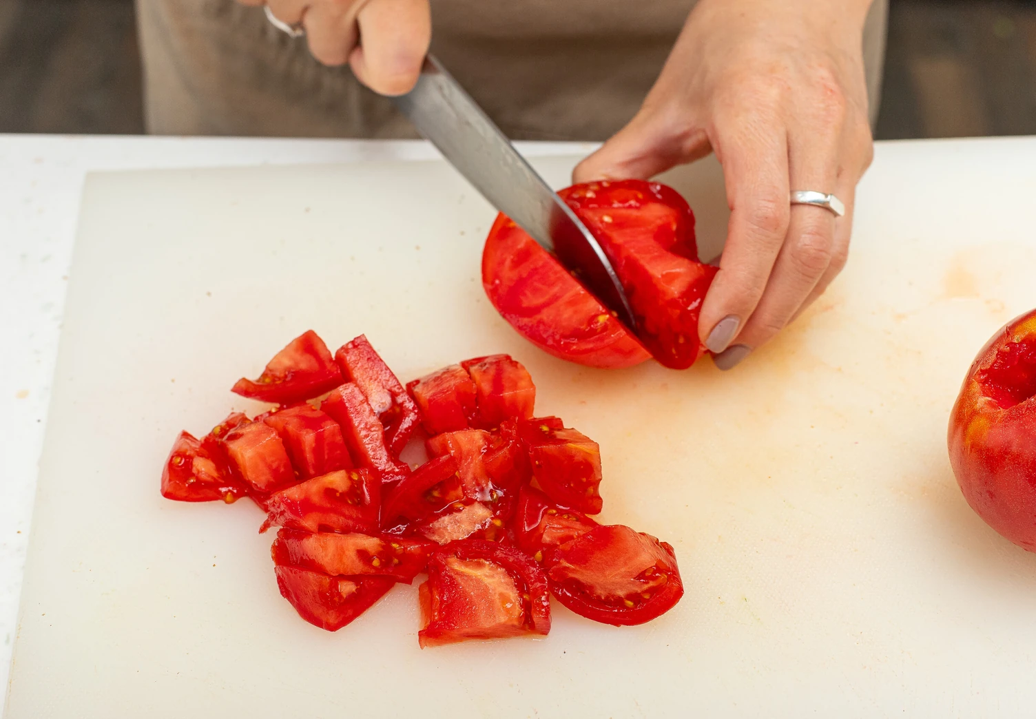 У помидоров удалите плодоножки и нарежьте овощи средними ломтиками.