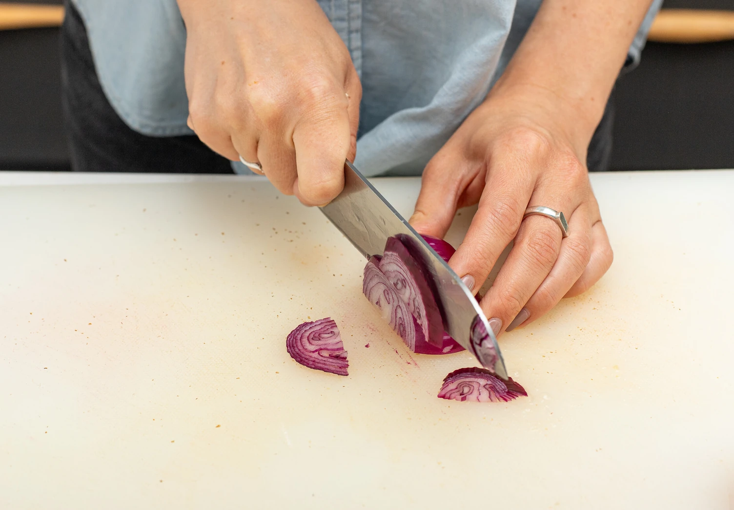 Лук почистите и нарежьте тонкими кольцами, а их затем — четвертинками.