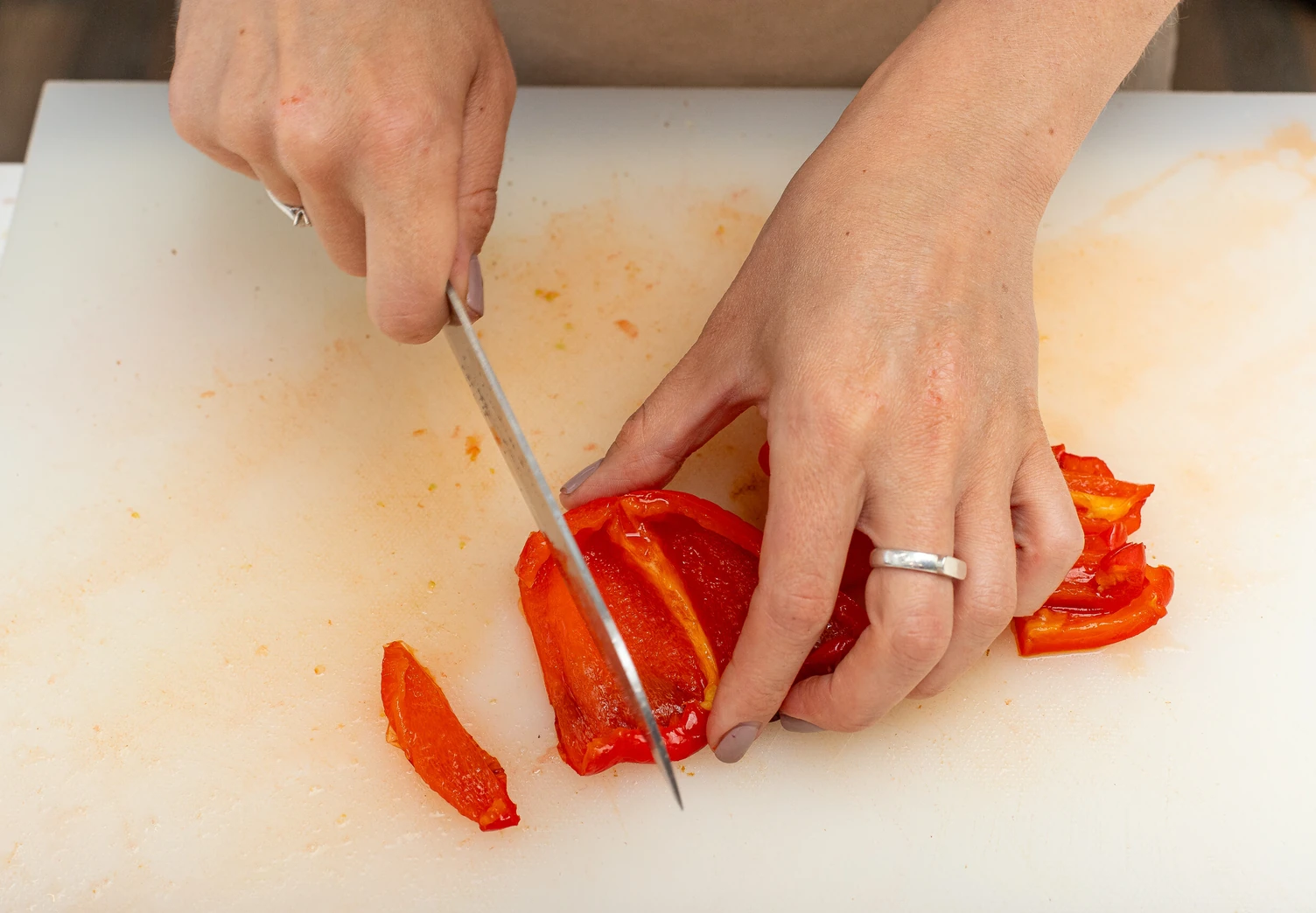 Остывший запечённый перец очистите от кожицы и нарежьте ломтиками среднего размера.