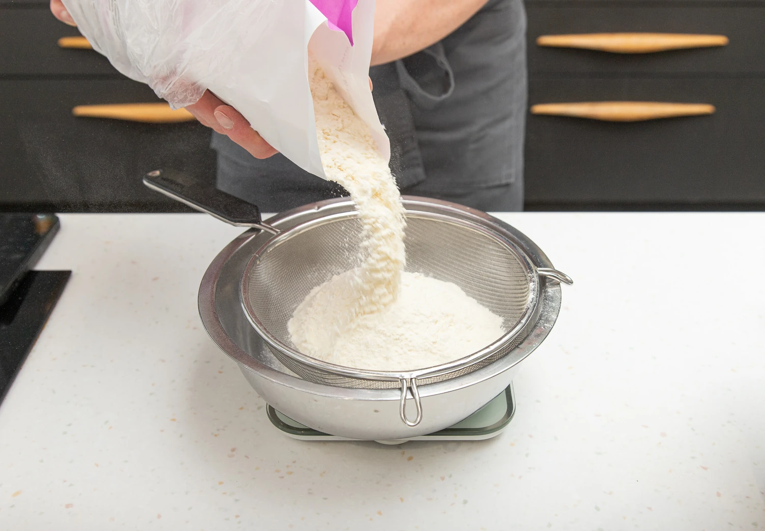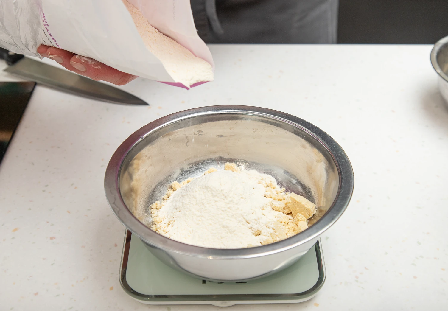Смешайте муку, разрыхлитель, миндальную и сахарную пудру в глубокой миске.