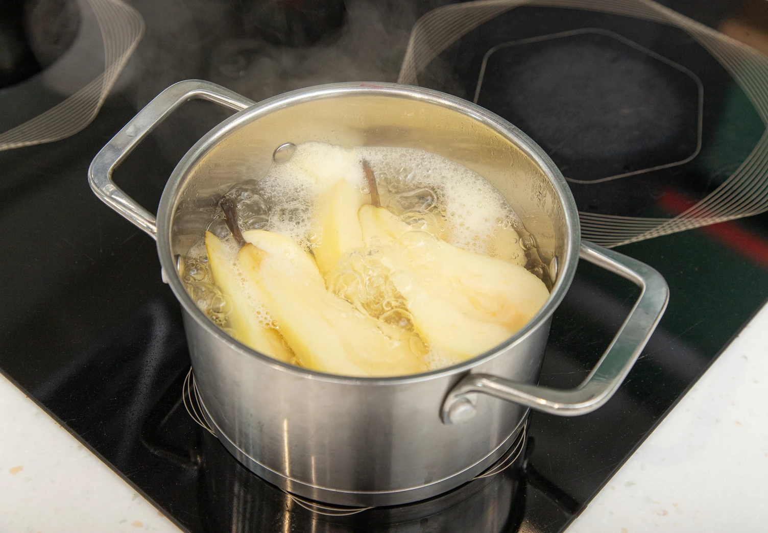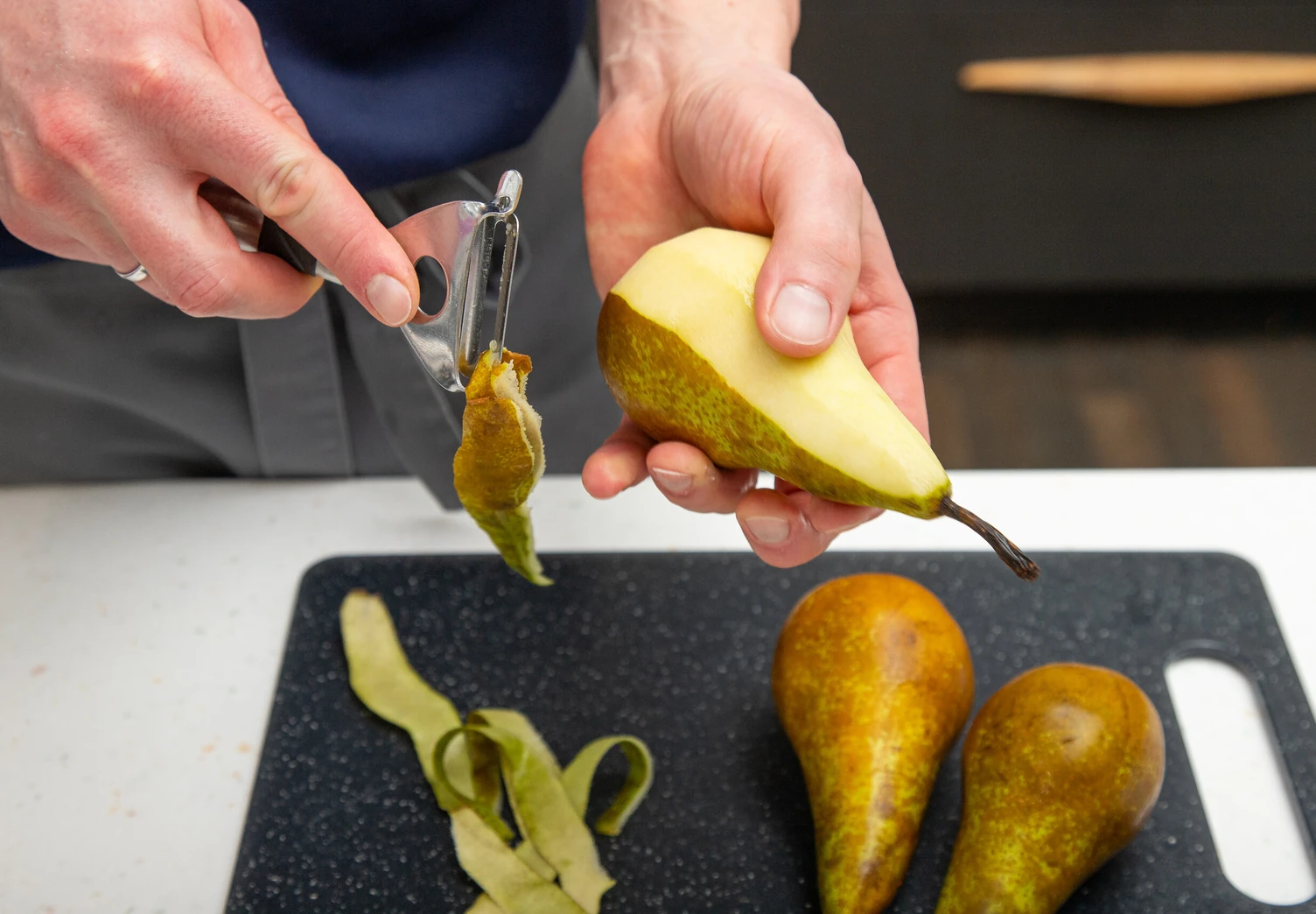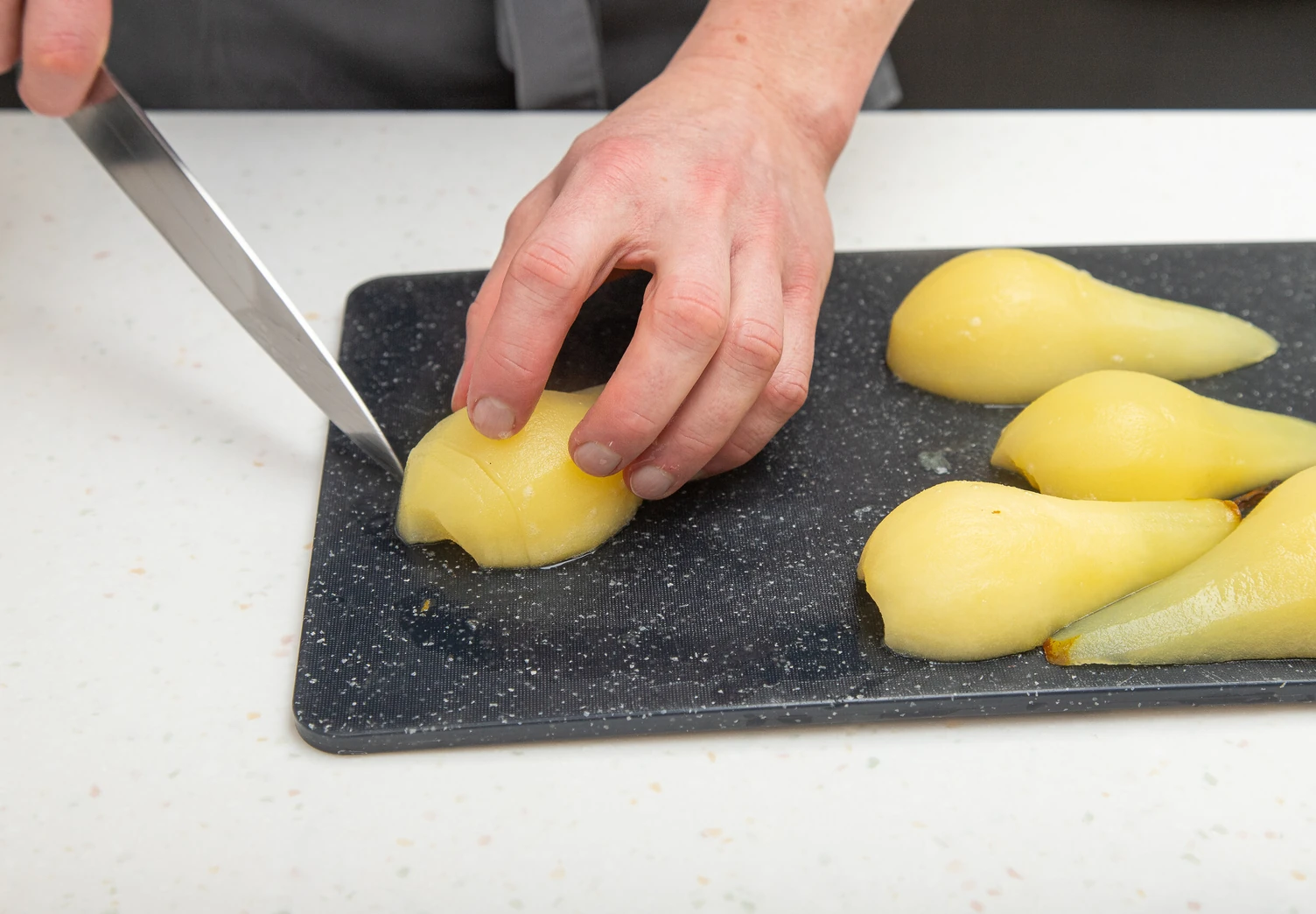 Очистите груши, разрежьте пополам вдоль и удалите сердцевины.