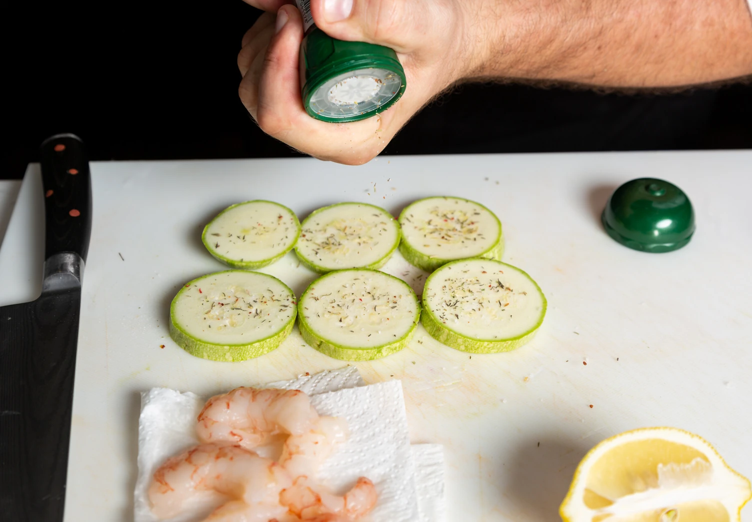 Кабачок нарежьте кружочками, посолите и поперчите по вкусу.