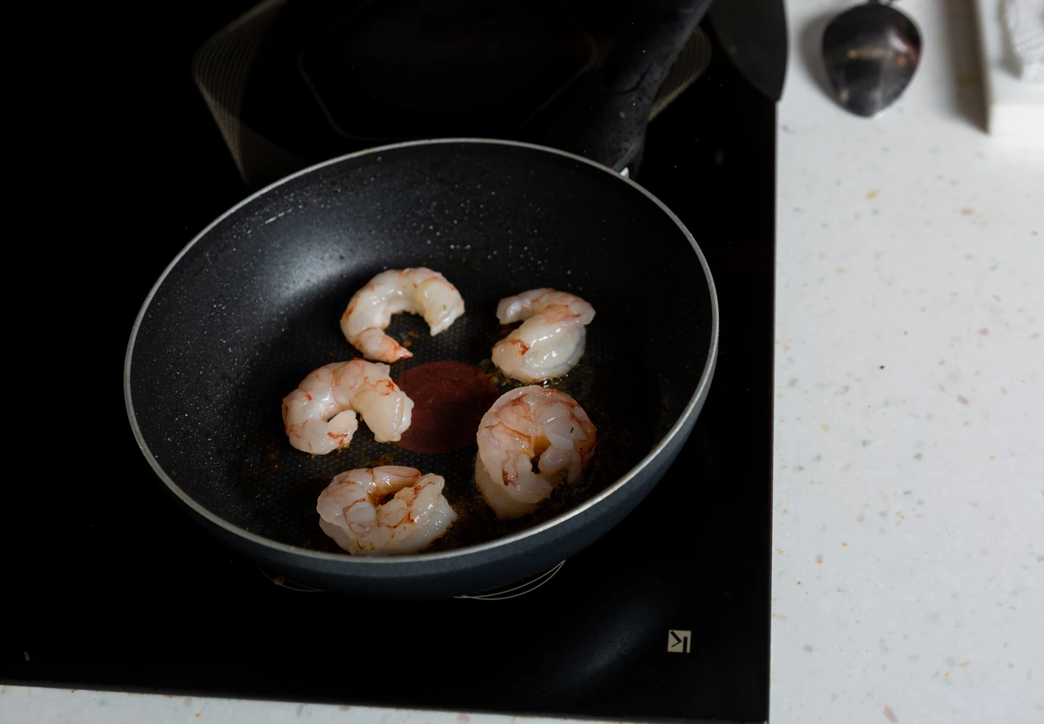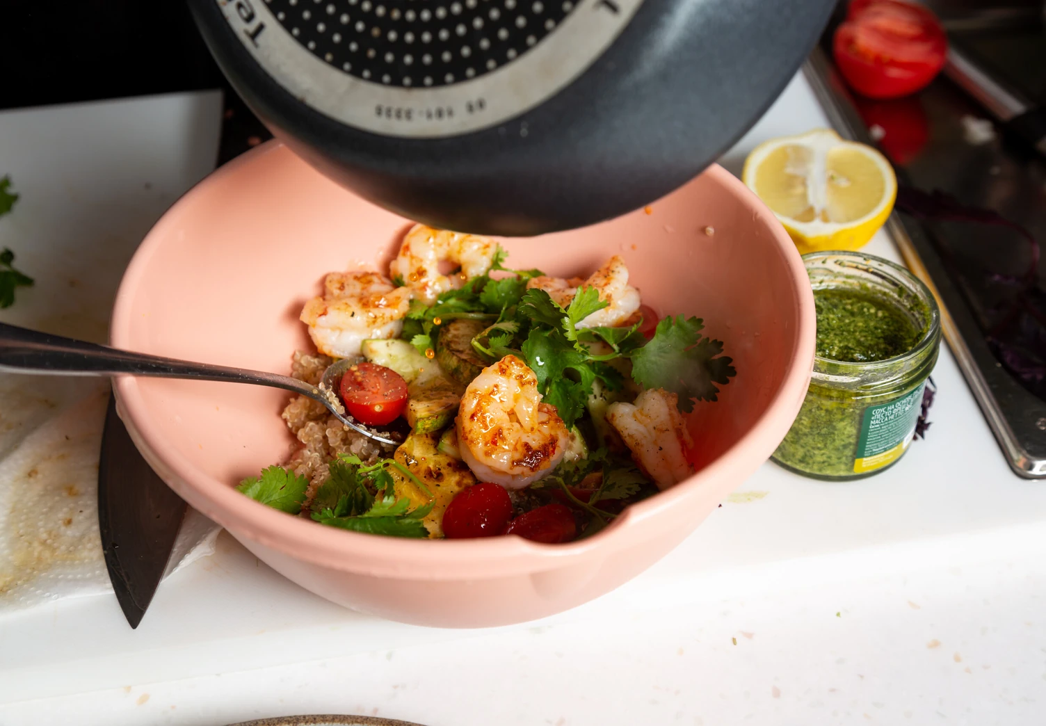 Разморозьте креветки заранее в холодильнике или за полчаса в ледяной воде прямо в упаковке. Киноа отварите согласно инструкции на упаковке.
