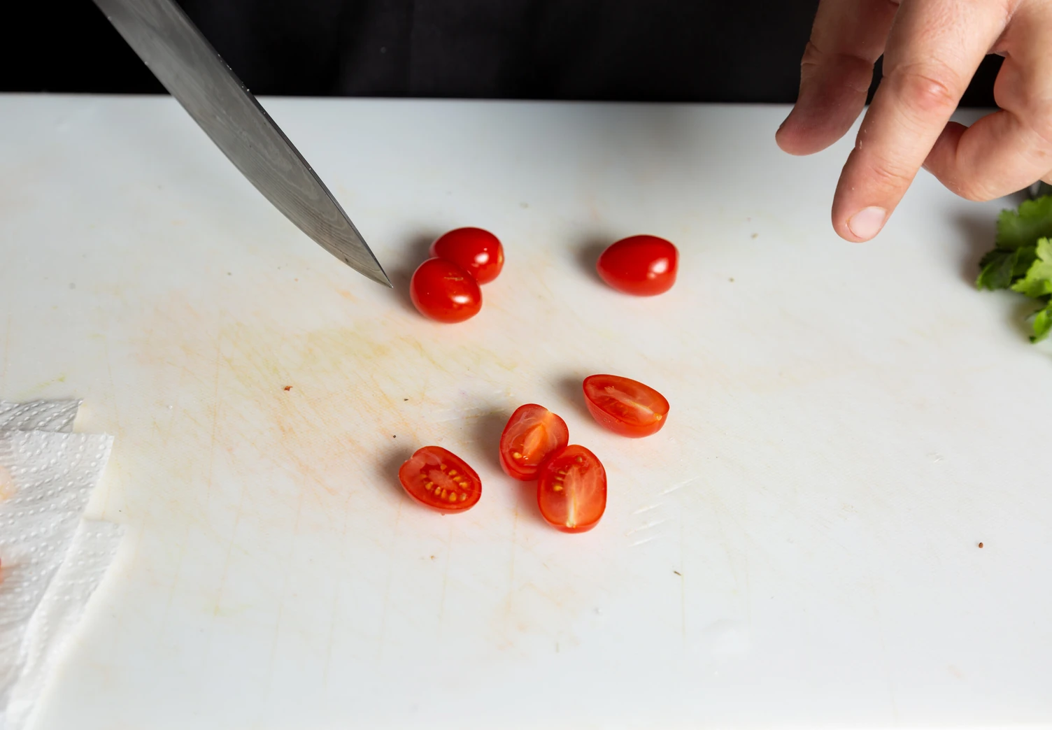 Обжаренные кружки кабачков разрежьте пополам, черри — на половинки. Кинзу мелко порубите, оливковое масло смешайте с лимонным соком.