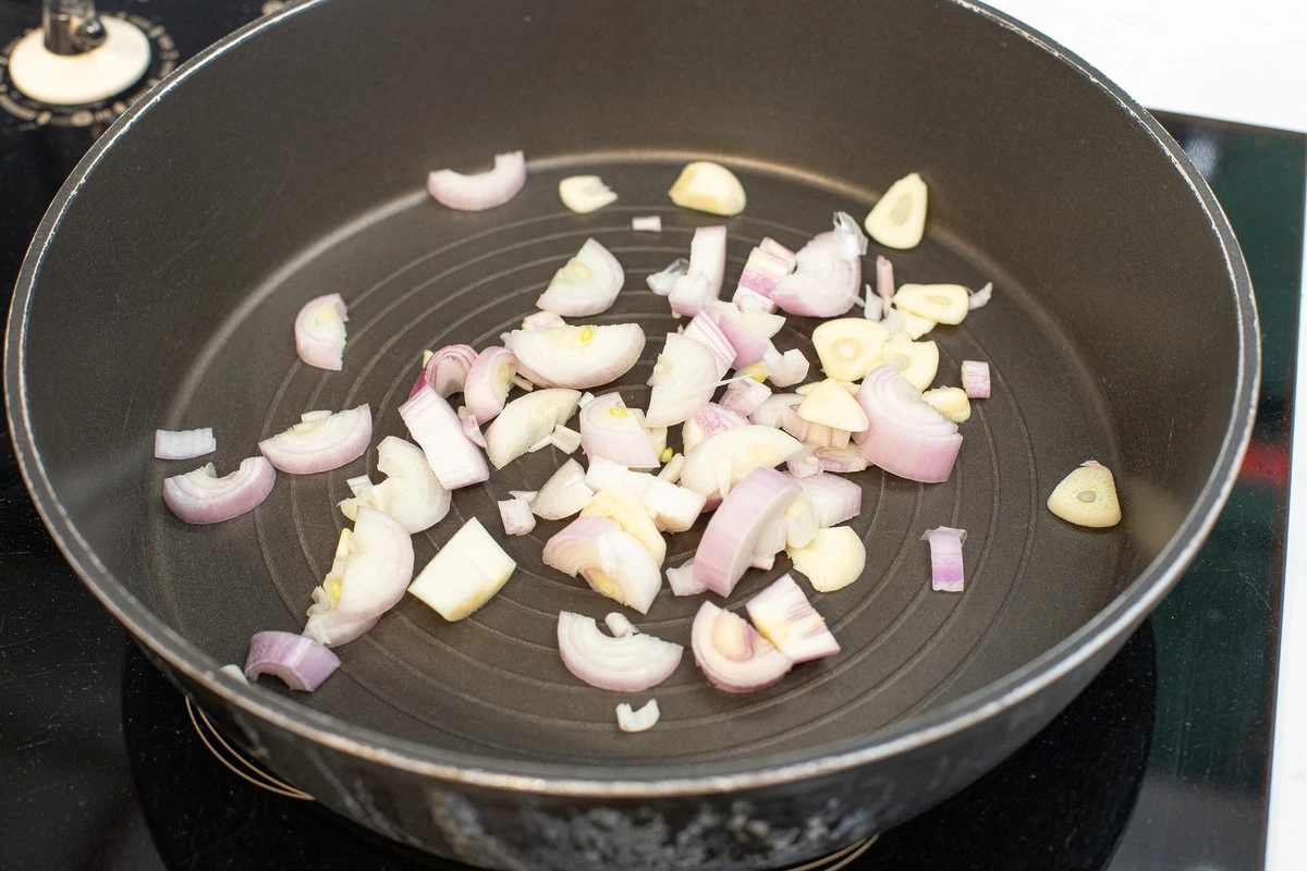 Разогрейте сковороду с 1-2 ст. л. растительного масла, выложите на неё лук и чеснок и готовьте 2-3 минуты, периодически помешивая.