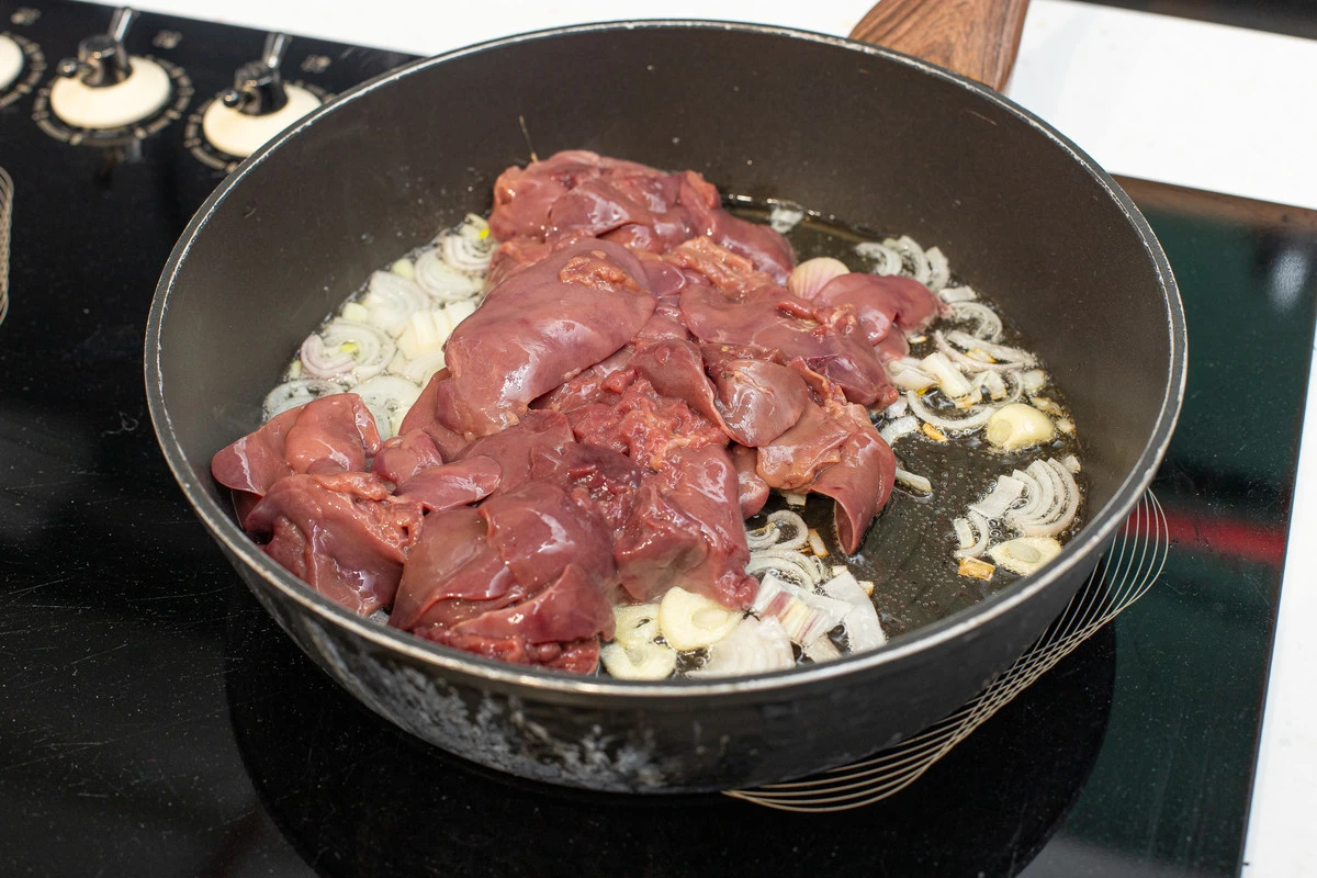 Печень промойте, очистите от плёнок и протоков. Нарежьте крупно и добавьте к луку с чесноком. Посолите, поперчите и обжарьте всё вместе в общей сложности 15 минут, периодически помешивая.