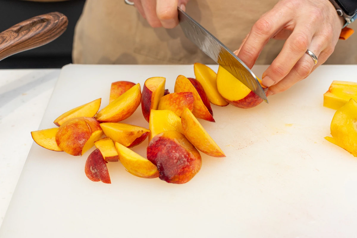 У персиков удалите косточки, мякоть нарежьте кубиками.