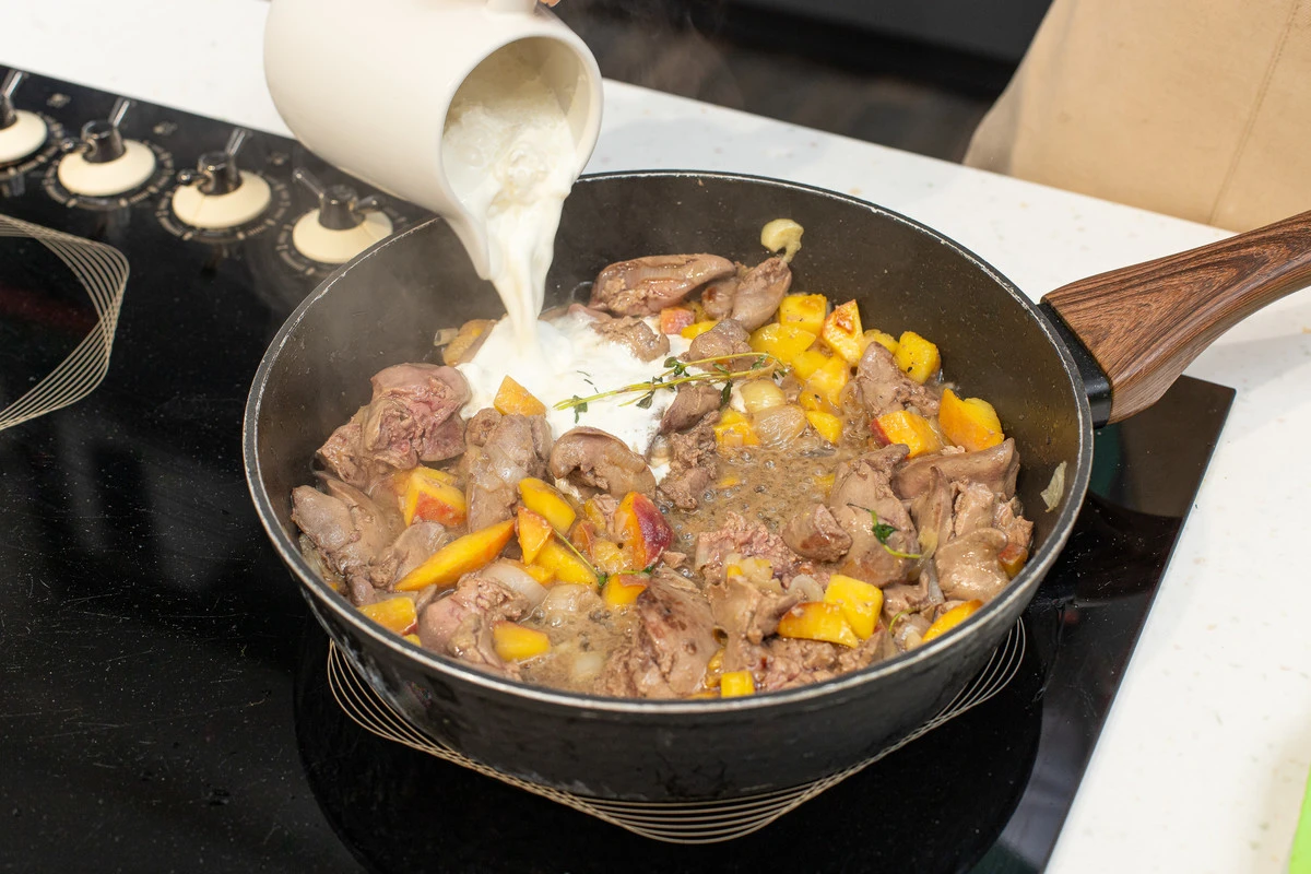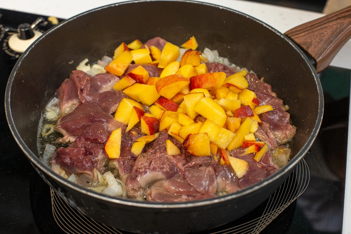 Примерно через 10 минут после начала приготовления печени добавьте половину персиков.