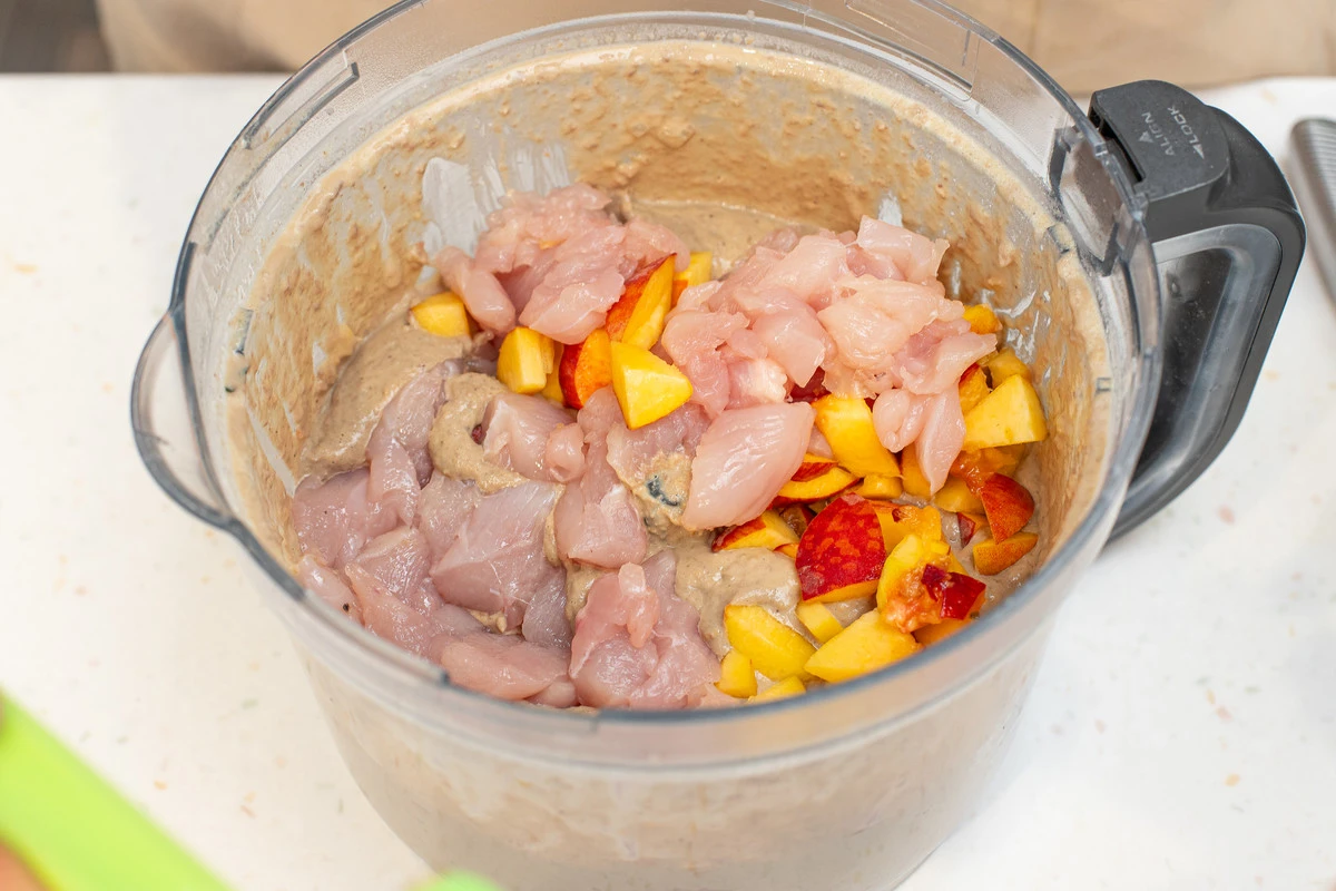 Добавьте нарезанные кубиками персики и филе грудки цыплёнка и перемешайте ложкой, измельчать не нужно. Переложите всё в форму и выпекайте в разогретой до 180 ℃ духовке примерно 35 минут.