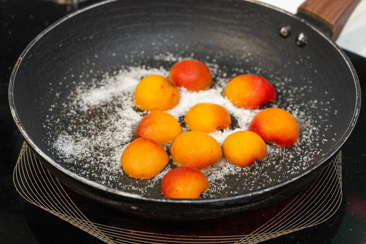 Пока запекается риет, у абрикосов удалите косточки. Выложите половинки на сковороду, добавьте немного сахара и слегка карамелизуйте их. Абрикосы должны стать мягкими, но не превратиться в кашу.